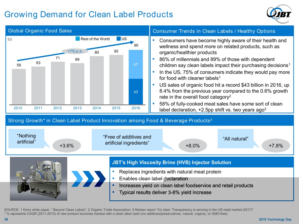 Growing Demand for Clean Label Products Global Organic Food Sales Consumer Trends in Clean Labels / Healthy Options $B Rest of the World US ▪ Consumers have become highly aware of their health and 90 wellness and spend more on related products, such as +7% p.a. 80 82 organic/healthier products 71 69 ▪ 86% of millennials and 89% of those with dependent 63 59 47 children say clean labels impact their purchasing decisions1 ▪ In the US, 75% of consumers indicate they would pay more for food with cleaner labels1 ▪ US sales of organic food hit a record $43 billion in 2016, up 43 8.4% from the previous year compared to the 0.6% growth rate in the overall food category2 ▪ 58% of fully-cooked meat sales have some sort of clean 2010 2011 2012 2013 2014 2015 2016 label declaration, +2.5pp shift vs. two years ago3 Strong Growth* in Clean Label Product Innovation among Food & Beverage Products3 “Nothing “Free of additives and “All natural” artificial” artificial ingredients” +3.6% +8.0% +7.8% JBT’s High Viscosity Brine (HVB) Injector Solution ▪ Replaces ingredients with natural meat protein ▪ Enables clean label declaration ▪ Increases yield on clean label foodservice and retail products ▪ Typical results deliver 3-8% yield increase SOURCE: 1 Kerry white paper, “ Beyond Clean Labels”; 2 Organic Trade Association; 3 Nielsen report “It’s clear: Transparency is winning in the US retail market (2017)” * % represents CAGR (2011-2015) of new product launches tracked with a clean label claim (no additives/preservatives, natural, organic, or GMO-free) 38 2018 Technology Day