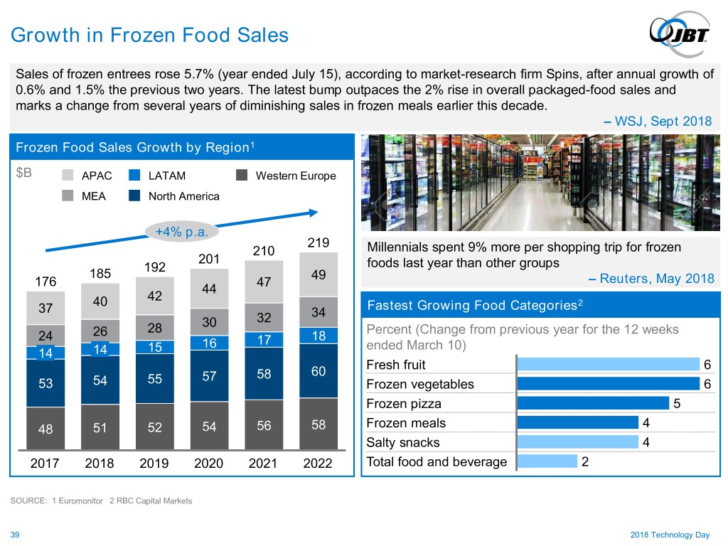 Growth in Frozen Food Sales Sales of frozen entrees rose 5.7% (year ended July 15), according to market-research firm Spins, after annual growth of 0.6% and 1.5% the previous two years. The latest bump outpaces the 2% rise in overall packaged-food sales and marks a change from several years of diminishing sales in frozen meals earlier this decade. – WSJ, Sept 2018 Frozen Food Sales Growth by Region1 $B APAC LATAM Western Europe MEA North America +4% p.a. 219 210 Millennials spent 9% more per shopping trip for frozen 201 192 foods last year than other groups 185 49 176 47 – Reuters, May 2018 44 42 40 Fastest Growing Food Categories2 37 34 30 32 28 Percent (Change from previous year for the 12 weeks 24 26 18 16 17 ended March 10) 14 14 15 Fresh fruit 6 57 58 60 53 54 55 Frozen vegetables 6 Frozen pizza 5 48 51 52 54 56 58 Frozen meals 4 Salty snacks 4 2017 2018 2019 2020 2021 2022 Total food and beverage 2 SOURCE: 1 Euromonitor 2 RBC Capital Markets 39 2018 Technology Day