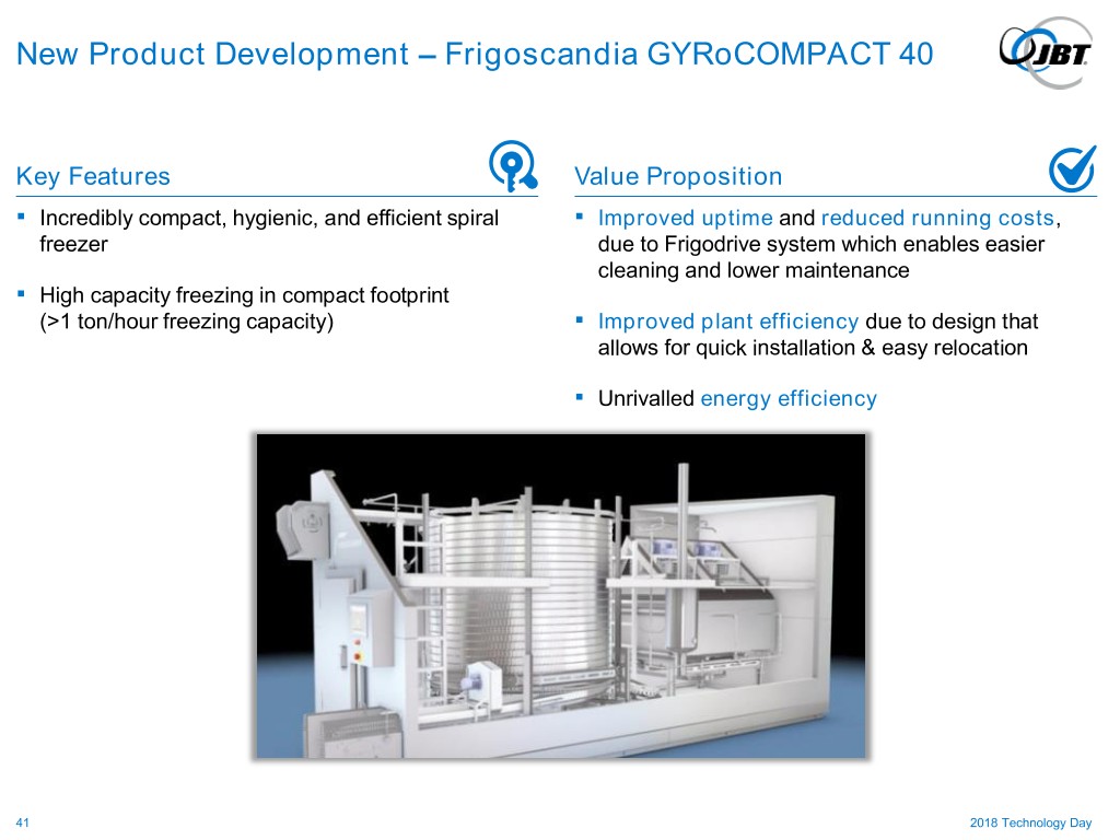 New Product Development – Frigoscandia GYRoCOMPACT 40 Key Features Value Proposition ▪ Incredibly compact, hygienic, and efficient spiral ▪ Improved uptime and reduced running costs, freezer due to Frigodrive system which enables easier cleaning and lower maintenance ▪ High capacity freezing in compact footprint (>1 ton/hour freezing capacity) ▪ Improved plant efficiency due to design that allows for quick installation & easy relocation ▪ Unrivalled energy efficiency 41 2018 Technology Day