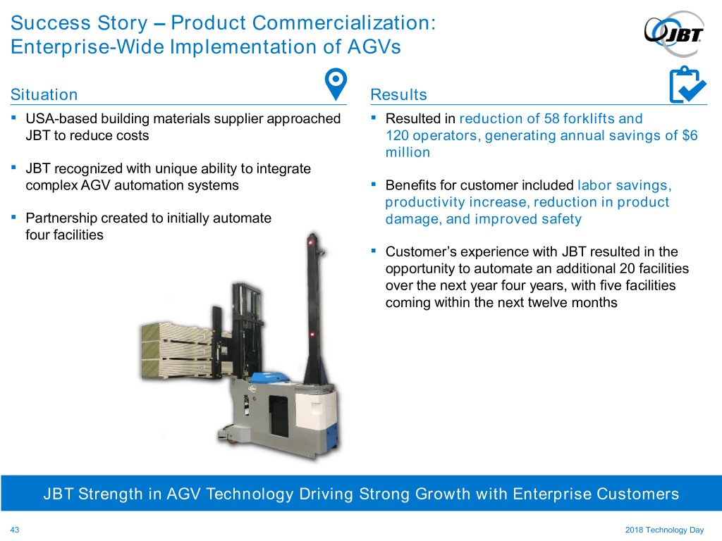Success Story – Product Commercialization: Enterprise-Wide Implementation of AGVs Situation Results ▪ USA-based building materials supplier approached ▪ Resulted in reduction of 58 forklifts and JBT to reduce costs 120 operators, generating annual savings of $6 million ▪ JBT recognized with unique ability to integrate complex AGV automation systems ▪ Benefits for customer included labor savings, productivity increase, reduction in product ▪ Partnership created to initially automate damage, and improved safety four facilities ▪ Customer’s experience with JBT resulted in the opportunity to automate an additional 20 facilities over the next year four years, with five facilities coming within the next twelve months JBT Strength in AGV Technology Driving Strong Growth with Enterprise Customers 43 2018 Technology Day