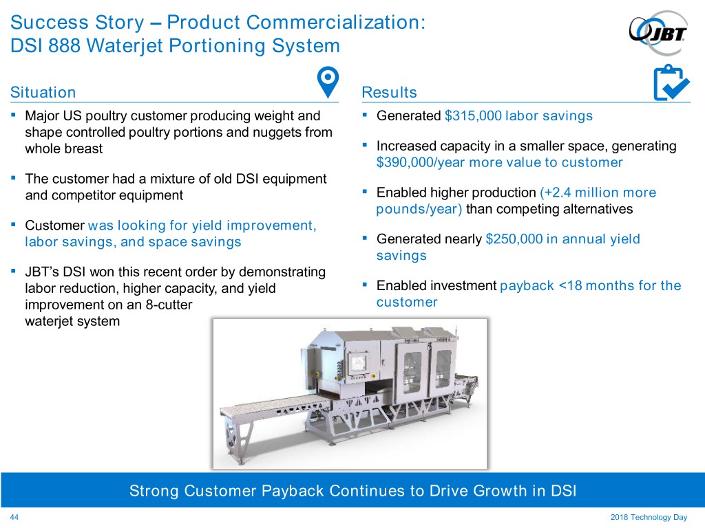 Success Story – Product Commercialization: DSI 888 Waterjet Portioning System Situation Results ▪ Major US poultry customer producing weight and ▪ Generated $315,000 labor savings shape controlled poultry portions and nuggets from whole breast ▪ Increased capacity in a smaller space, generating $390,000/year more value to customer ▪ The customer had a mixture of old DSI equipment and competitor equipment ▪ Enabled higher production (+2.4 million more pounds/year) than competing alternatives ▪ Customer was looking for yield improvement, labor savings, and space savings ▪ Generated nearly $250,000 in annual yield savings ▪ JBT’s DSI won this recent order by demonstrating labor reduction, higher capacity, and yield ▪ Enabled investment payback <18 months for the improvement on an 8-cutter customer waterjet system Strong Customer Payback Continues to Drive Growth in DSI 44 2018 Technology Day