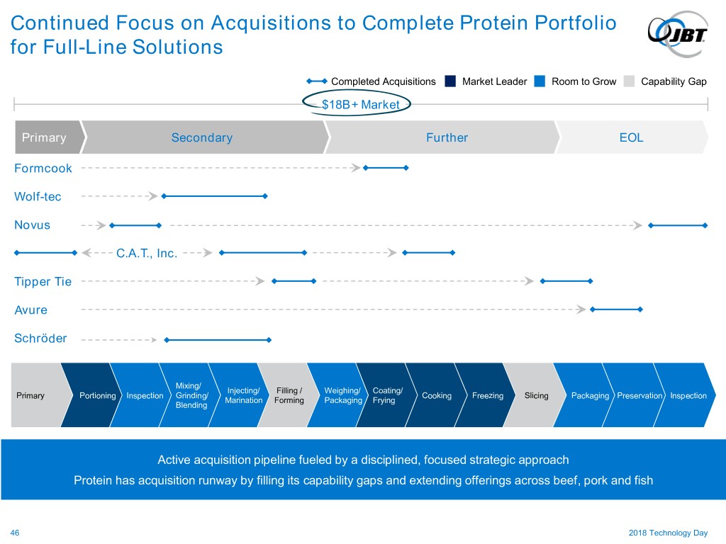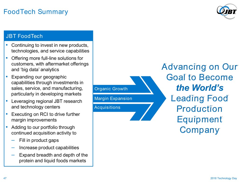 Continued Focus on Acquisitions to Complete Protein Portfolio for Full-Line Solutions Completed Acquisitions Market Leader Room to Grow Capability Gap $18B+ Market Primary Secondary Further EOL Formcook Wolf-tec Novus C.A.T., Inc. Tipper Tie Avure Schröder Mixing/ Injecting/ Filling / Weighing/ Coating/ Primary Portioning Inspection Grinding/ Cooking Freezing Slicing Packaging Preservation Inspection Marination Forming Packaging Frying Blending Active acquisition pipeline fueled by a disciplined, focused strategic approach Protein has acquisition runway by filling its capability gaps and extending offerings across beef, pork and fish 46 2018 Technology Day