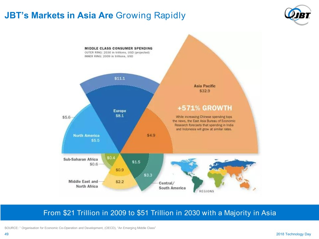 JBT’s Markets in Asia Are Growing Rapidly From $21 Trillion in 2009 to $51 Trillion in 2030 with a Majority in Asia SOURCE: 1 Organisation for Economic Co-Operation and Development, (OECD), “An Emerging Middle Class” 49 2018 Technology Day