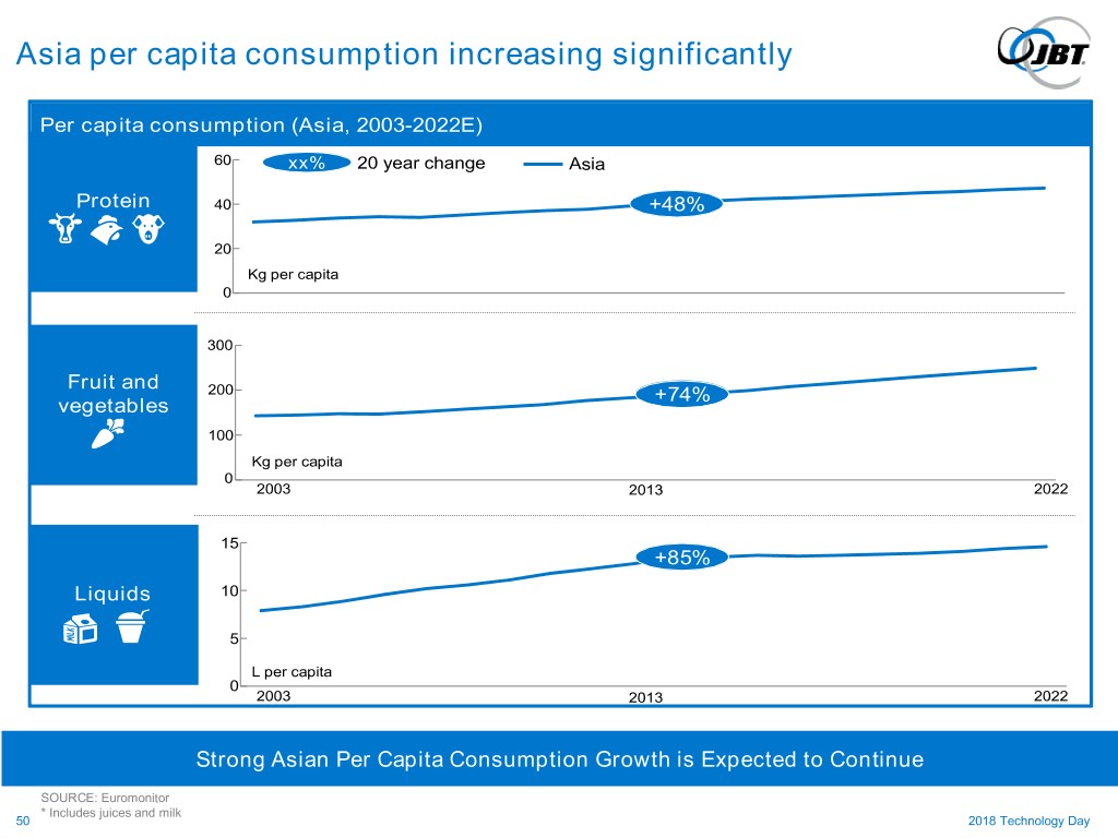Asia per capita consumption increasing significantly Per capita consumption (Asia, 2003-2022E)) 60 xx% 20 year change Asia Protein 40 +48% 20 Kg per capita 0 300 Fruit and 200 +74% vegetables 100 Kg per capita 0 2003 2013 2022 15 +85% Liquids 10 5 L per capita 0 2003 2013 2022 Strong Asian Per Capita Consumption Growth is Expected to Continue SOURCE: Euromonitor * Includes juices and milk 50 2018 Technology Day