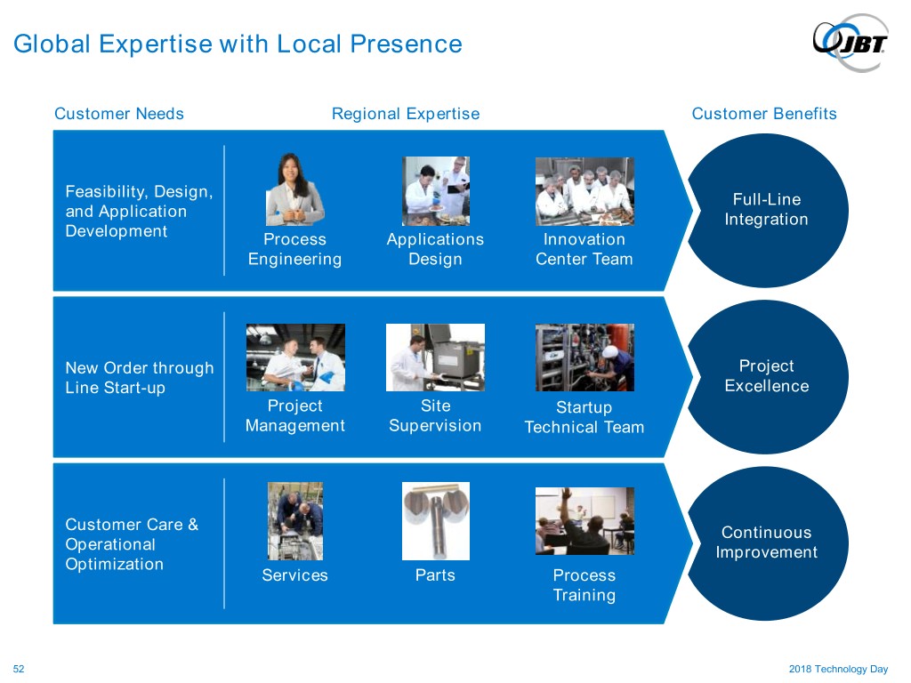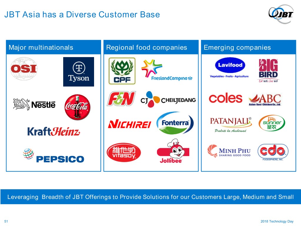JBT Asia has a Diverse Customer Base Major multinationals Regional food companies Emerging companies Leveraging Breadth of JBT Offerings to Provide Solutions for our Customers Large, Medium and Small 51 2018 Technology Day