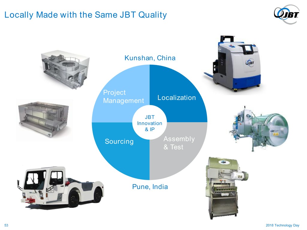 Locally Made with the Same JBT Quality Kunshan, China Project Management Localization JBT Innovation & IP Sourcing Assembly & Test Pune, India 53 2018 Technology Day