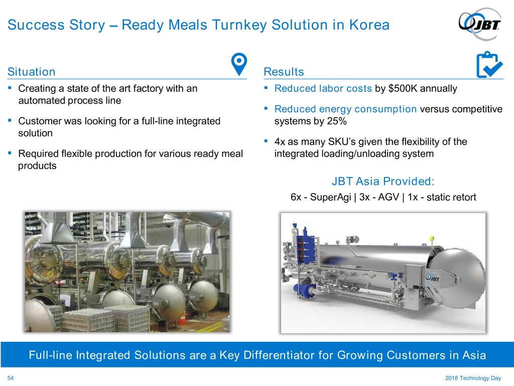 Success Story – Ready Meals Turnkey Solution in Korea Situation Results ▪ Creating a state of the art factory with an ▪ Reduced labor costs by $500K annually automated process line ▪ Reduced energy consumption versus competitive ▪ Customer was looking for a full-line integrated systems by 25% solution ▪ 4x as many SKU’s given the flexibility of the ▪ Required flexible production for various ready meal integrated loading/unloading system products JBT Asia Provided: 6x - SuperAgi | 3x - AGV | 1x - static retort Full-line Integrated Solutions are a Key Differentiator for Growing Customers in Asia 54 2018 Technology Day