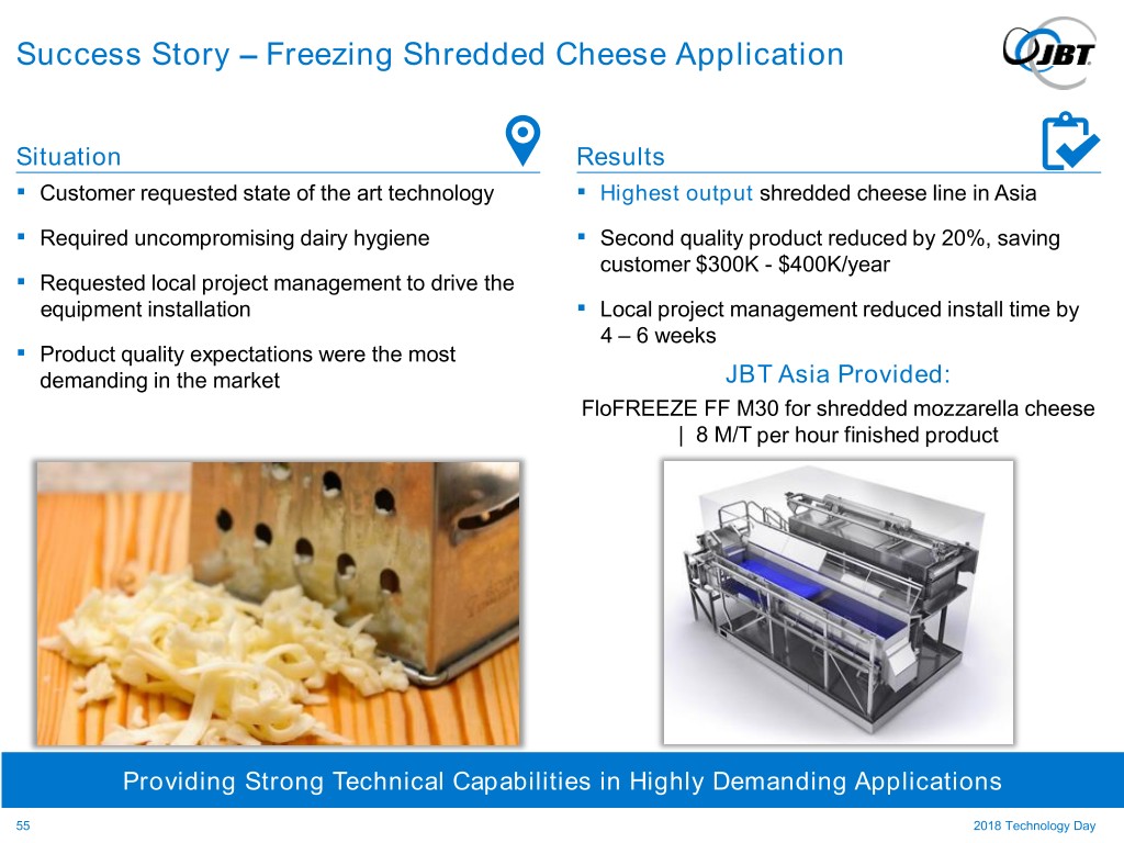 Success Story – Freezing Shredded Cheese Application Situation Results ▪ Customer requested state of the art technology ▪ Highest output shredded cheese line in Asia ▪ Required uncompromising dairy hygiene ▪ Second quality product reduced by 20%, saving customer $300K - $400K/year ▪ Requested local project management to drive the equipment installation ▪ Local project management reduced install time by 4 – 6 weeks ▪ Product quality expectations were the most demanding in the market JBT Asia Provided: FloFREEZE FF M30 for shredded mozzarella cheese | 8 M/T per hour finished product Providing Strong Technical Capabilities in Highly Demanding Applications 55 2018 Technology Day