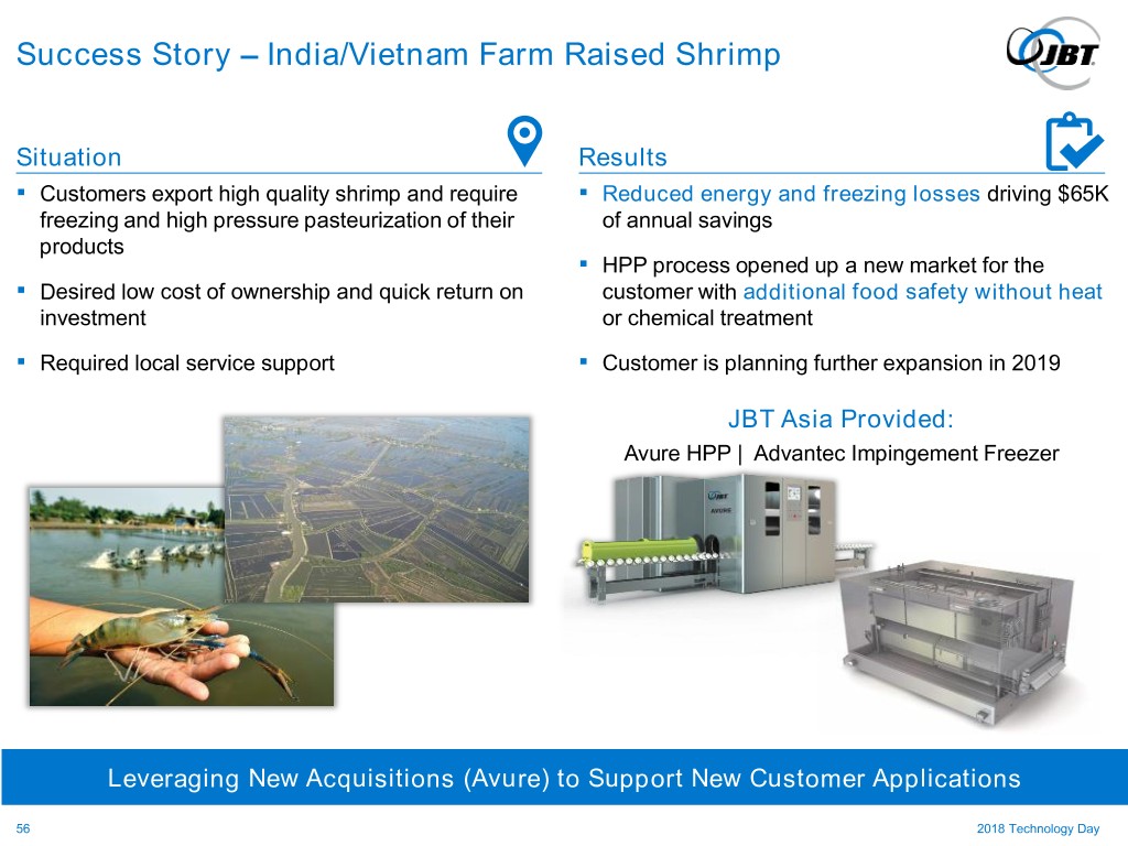 Success Story – India/Vietnam Farm Raised Shrimp Situation Results ▪ Customers export high quality shrimp and require ▪ Reduced energy and freezing losses driving $65K freezing and high pressure pasteurization of their of annual savings products ▪ HPP process opened up a new market for the ▪ Desired low cost of ownership and quick return on customer with additional food safety without heat investment or chemical treatment ▪ Required local service support ▪ Customer is planning further expansion in 2019 JBT Asia Provided: Avure HPP | Advantec Impingement Freezer Leveraging New Acquisitions (Avure) to Support New Customer Applications 56 2018 Technology Day
