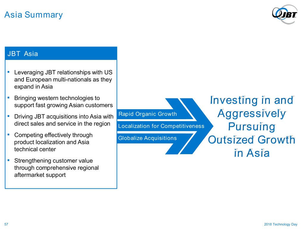 Asia Summary JBT Asia ▪ Leveraging JBT relationships with US and European multi-nationals as they expand in Asia ▪ Bringing western technologies to support fast growing Asian customers Investing in and ▪ Driving JBT acquisitions into Asia with Rapid Organic Growth Aggressively direct sales and service in the region Localization for Competitiveness Pursuing Competing effectively through ▪ Globalize Acquisitions product localization and Asia Outsized Growth technical center in Asia ▪ Strengthening customer value through comprehensive regional aftermarket support 57 2018 Technology Day