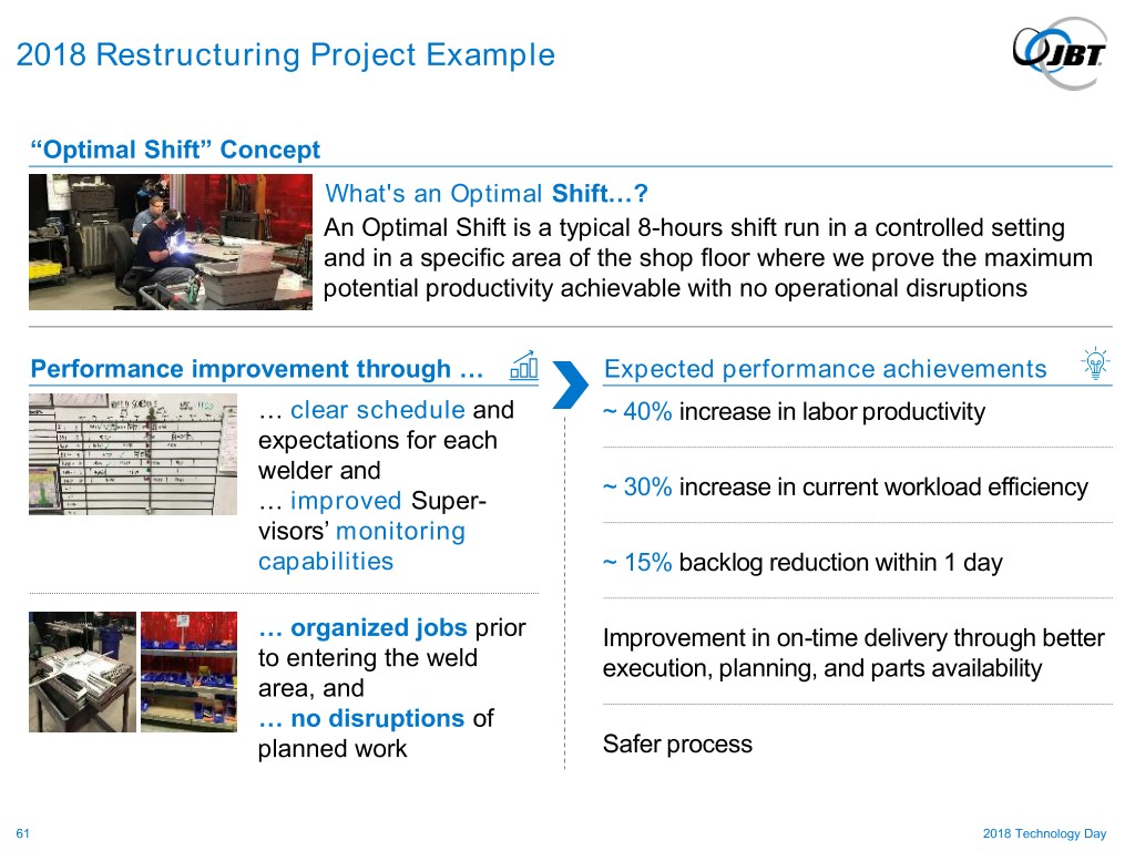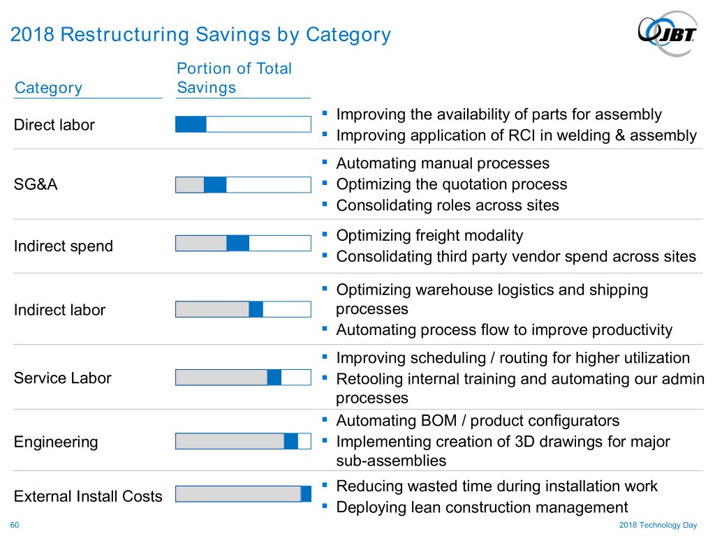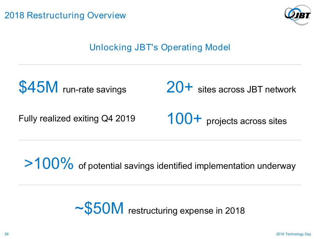 2018 Restructuring Overview Unlocking JBT's Operating Model $45M run-rate savings 20+ sites across JBT network Fully realized exiting Q4 2019 100+ projects across sites >100% of potential savings identified implementation underway ~$50M restructuring expense in 2018 59 2018 Technology Day