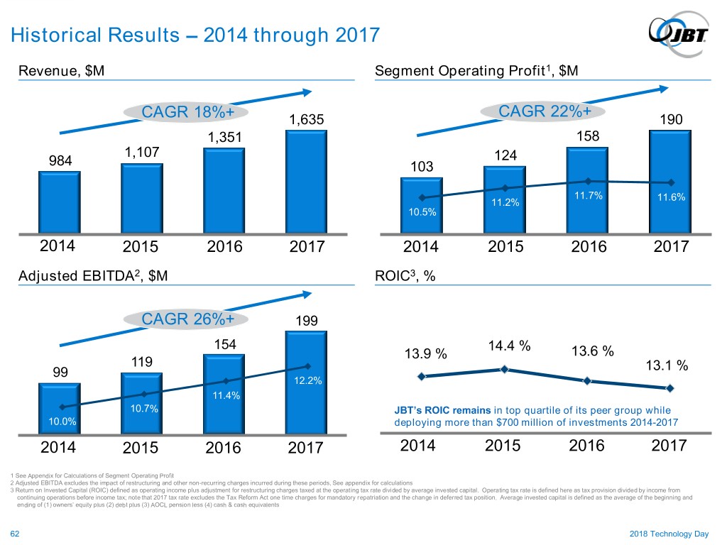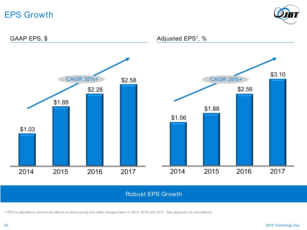 Historical Results – 2014 through 2017 Revenue, $M Segment Operating Profit1, $M CAGR 22%+ CAGR 18%+ 1,635 190 1,351 158 1,107 124 984 103 11.7% 11.6% 11.2% 10.5% 2014 2015 2016 2017 2014 2015 2016 2017 Adjusted EBITDA2, $M ROIC3, % CAGR 26%+ 199 154 14.4 % 13.9 % 13.6 % 119 99 13.1 % 12.2% 11.4% 10.7% JBT’s ROIC remains in top quartile of its peer group while 10.0% deploying more than $700 million of investments 2014-2017 2014 2015 2016 2017 2014 2015 2016 2017 1 See Appendix for Calculations of Segment Operating Profit 2 Adjusted EBITDA excludes the impact of restructuring and other non-recurring charges incurred during these periods, See appendix for calculations 3 Return on Invested Capital (ROIC) defined as operating income plus adjustment for restructuring charges taxed at the operating tax rate divided by average invested capital. Operating tax rate is defined here as tax provision divided by income from continuing operations before income tax; note that 2017 tax rate excludes the Tax Reform Act one time charges for mandatory repatriation and the change in deferred tax position. Average invested capital is defined as the average of the beginning and ending of (1) owners’ equity plus (2) debt plus (3) AOCL pension less (4) cash & cash equivalents 62 2018 Technology Day