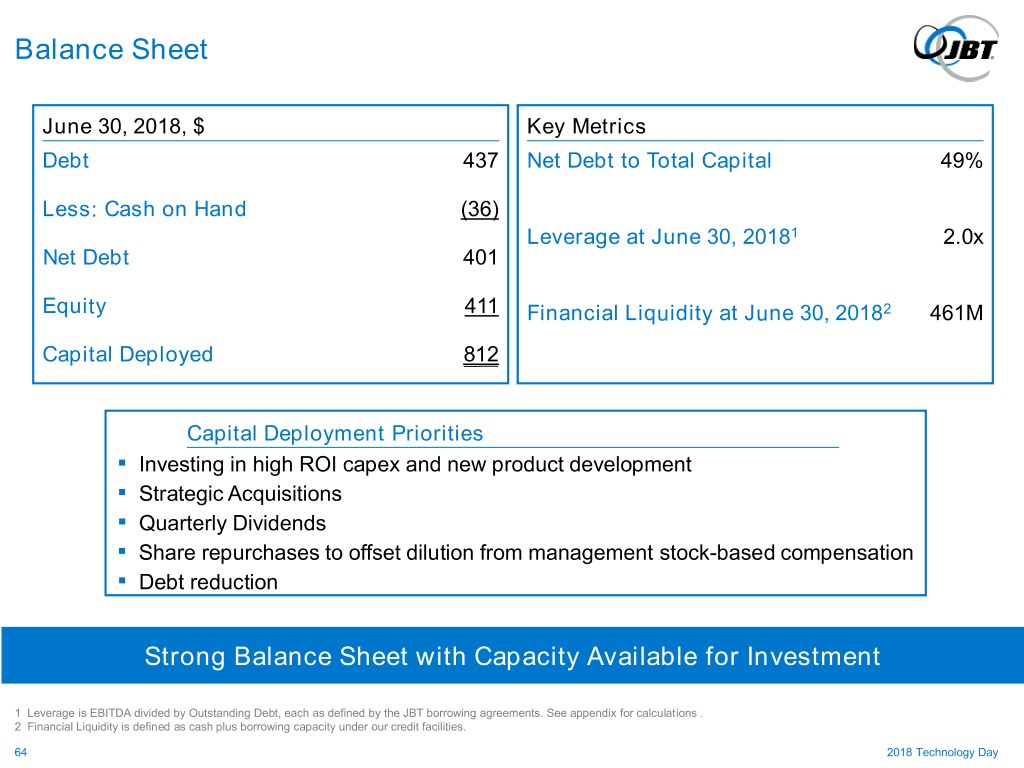 Balance Sheet June 30, 2018, $ Key Metrics Debt 437 Net Debt to Total Capital 49% Less: Cash on Hand (36) Leverage at June 30, 20181 2.0x Net Debt 401 Equity 411 Financial Liquidity at June 30, 20182 461M Capital Deployed 812 Capital Deployment Priorities ▪ Investing in high ROI capex and new product development ▪ Strategic Acquisitions ▪ Quarterly Dividends ▪ Share repurchases to offset dilution from management stock-based compensation ▪ Debt reduction Strong Balance Sheet with Capacity Available for Investment 1 Leverage is EBITDA divided by Outstanding Debt, each as defined by the JBT borrowing agreements. See appendix for calculations . 2 Financial Liquidity is defined as cash plus borrowing capacity under our credit facilities. 64 2018 Technology Day