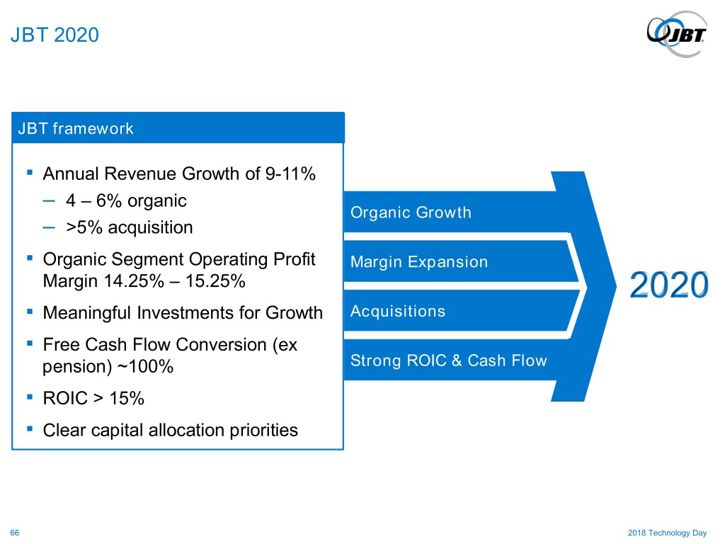 JBT 2020 JBT framework ▪ Annual Revenue Growth of 9-11% – 4 – 6% organic Organic Growth – >5% acquisition ▪ Organic Segment Operating Profit Margin Expansion Margin 14.25% – 15.25% 2020 ▪ Meaningful Investments for Growth Acquisitions ▪ Free Cash Flow Conversion (ex pension) ~100% Strong ROIC & Cash Flow ▪ ROIC > 15% ▪ Clear capital allocation priorities 66 2018 Technology Day