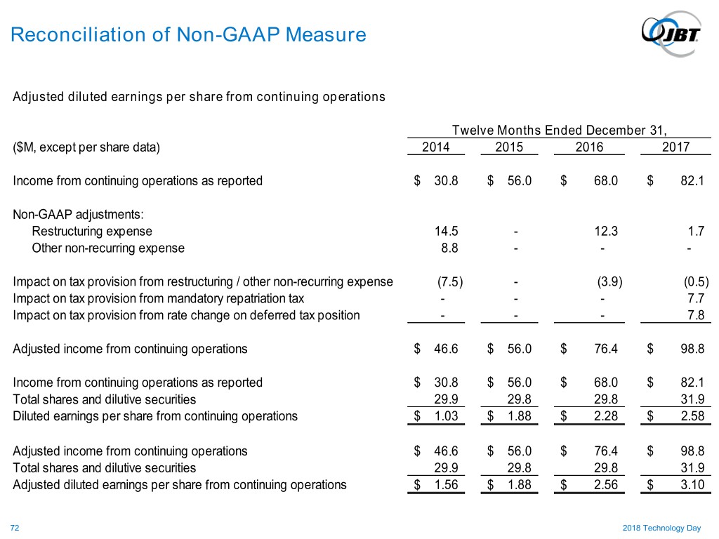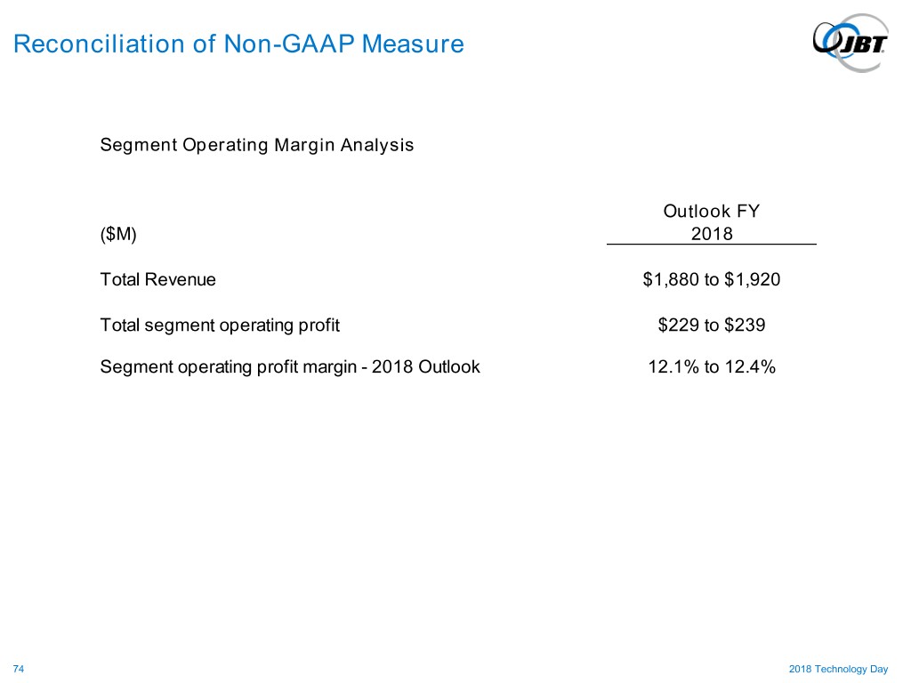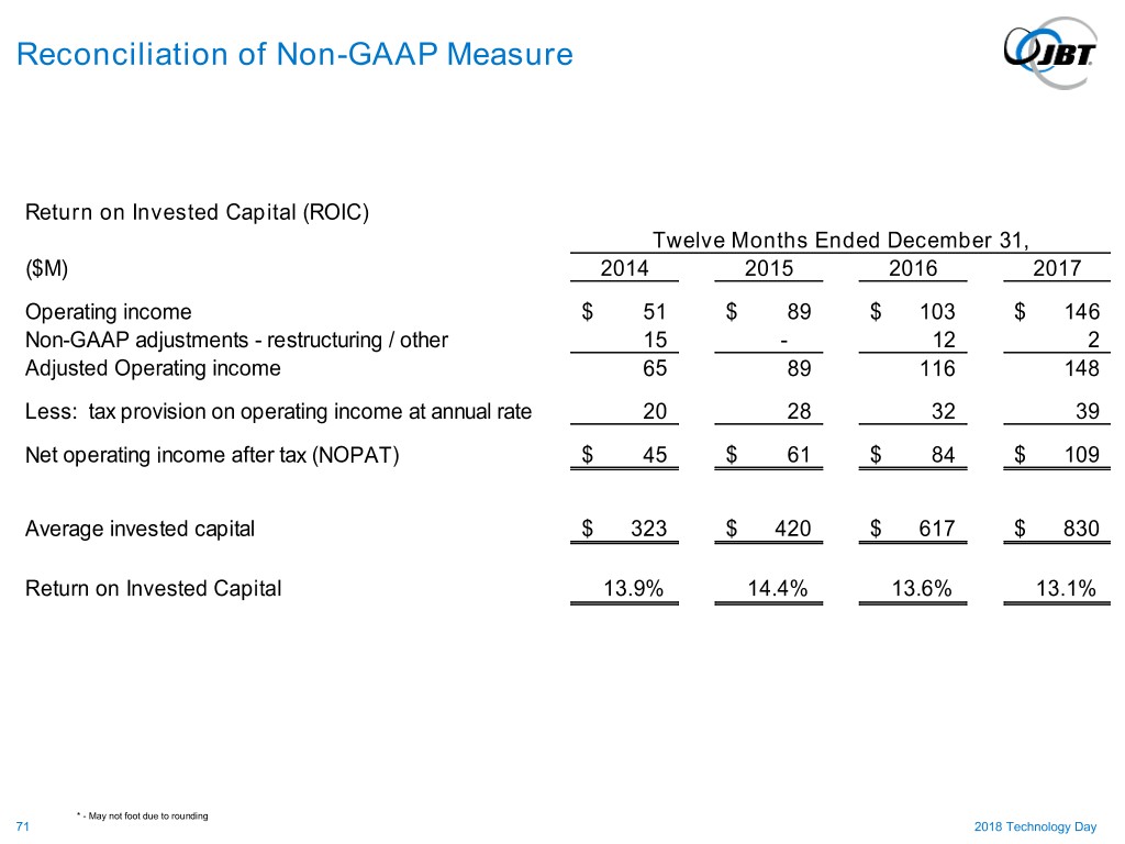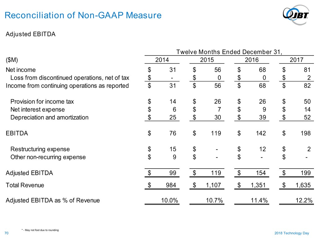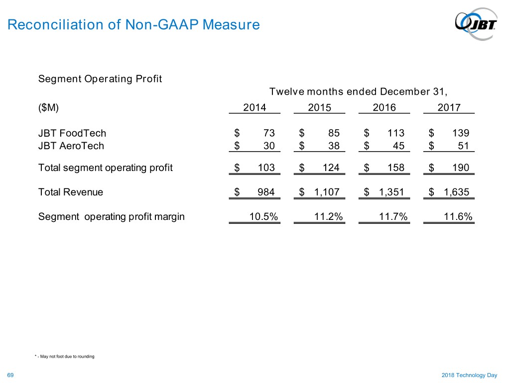 Reconciliation of Non-GAAP Measure Segment Operating Profit Twelve months ended December 31, ($M) 2014 2015 2016 2017 JBT FoodTech $ 73 $ 85 $ 113 $ 139 JBT AeroTech $ 30 $ 38 $ 45 $ 51 Total segment operating profit $ 103 $ 124 $ 158 $ 190 Total Revenue $ 984 $ 1,107 $ 1,351 $ 1,635 Segment operating profit margin 10.5% 11.2% 11.7% 11.6% * - May not foot due to rounding 69 2018 Technology Day