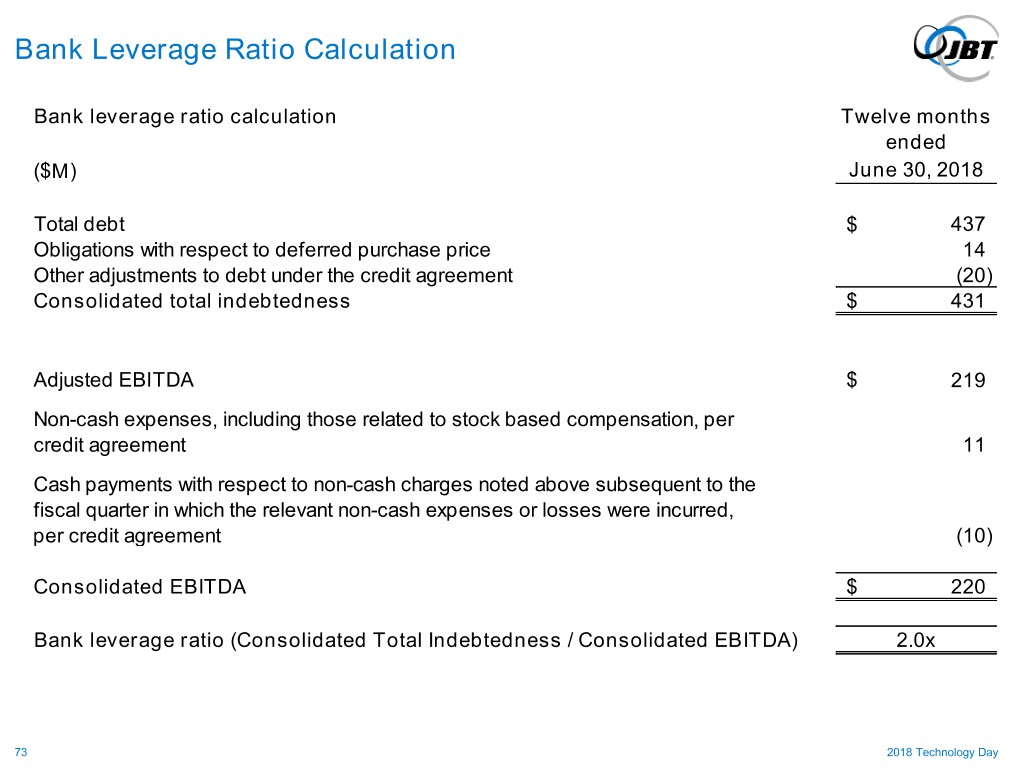 Bank Leverage Ratio Calculation Bank leverage ratio calculation Twelve months ended ($M) June 30, 2018 Total debt $ 437 Obligations with respect to deferred purchase price 14 Other adjustments to debt under the credit agreement (20) Consolidated total indebtedness $ 431 Adjusted EBITDA $ 219 Non-cash expenses, including those related to stock based compensation, per credit agreement 11 Cash payments with respect to non-cash charges noted above subsequent to the fiscal quarter in which the relevant non-cash expenses or losses were incurred, per credit agreement (10) Consolidated EBITDA $ 220 Bank leverage ratio (Consolidated Total Indebtedness / Consolidated EBITDA) 2.0x 73 2018 Technology Day
