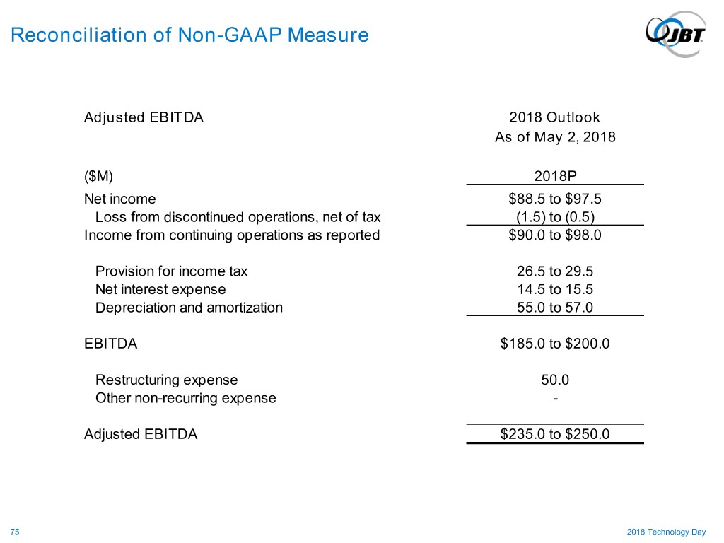 Reconciliation of Non-GAAP Measure Adjusted EBITDA 2018 Outlook As of May 2, 2018 ($M) 2018P Net income $88.5 to $97.5 Loss from discontinued operations, net of tax (1.5) to (0.5) Income from continuing operations as reported $90.0 to $98.0 Provision for income tax 26.5 to 29.5 Net interest expense 14.5 to 15.5 Depreciation and amortization 55.0 to 57.0 EBITDA $185.0 to $200.0 Restructuring expense 50.0 Other non-recurring expense - Adjusted EBITDA $235.0 to $250.0 75 2018 Technology Day