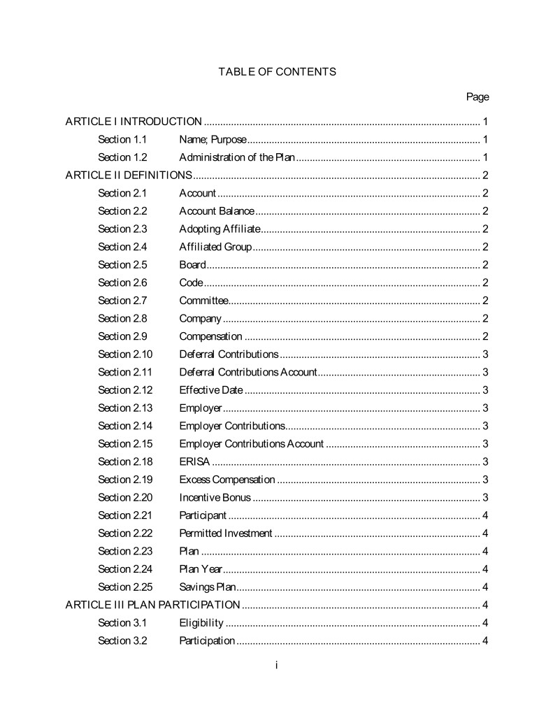 TABLE OF CONTENTS Page ARTICLE I INTRODUCTION ...................................................................................................... 1 Section 1.1 Name; Purpose ...................................................................................... 1 Section 1.2 Administration of the Plan .................................................................... 1 ARTICLE II DEFINITIONS .......................................................................................................... 2 Section 2.1 Account ................................................................................................. 2 Section 2.2 Account Balance ................................................................................... 2 Section 2.3 Adopting Affiliate ................................................................................. 2 Section 2.4 Affiliated Group .................................................................................... 2 Section 2.5 Board ..................................................................................................... 2 Section 2.6 Code ...................................................................................................... 2 Section 2.7 Committee ............................................................................................. 2 Section 2.8 Company ............................................................................................... 2 Section 2.9 Compensation ....................................................................................... 2 Section 2.10 Deferral Contributions .......................................................................... 3 Section 2.11 Deferral Contributions Account ............................................................ 3 Section 2.12 Effective Date ....................................................................................... 3 Section 2.13 Employer ............................................................................................... 3 Section 2.14 Employer Contributions ........................................................................ 3 Section 2.15 Employer Contributions Account ......................................................... 3 Section 2.18 ERISA ................................................................................................... 3 Section 2.19 Excess Compensation ........................................................................... 3 Section 2.20 Incentive Bonus .................................................................................... 3 Section 2.21 Participant ............................................................................................. 4 Section 2.22 Permitted Investment ............................................................................ 4 Section 2.23 Plan ....................................................................................................... 4 Section 2.24 Plan Year ............................................................................................... 4 Section 2.25 Savings Plan .......................................................................................... 4 ARTICLE III PLAN PARTICIPATION ........................................................................................ 4 Section 3.1 Eligibility .............................................................................................. 4 Section 3.2 Participation .......................................................................................... 4 i