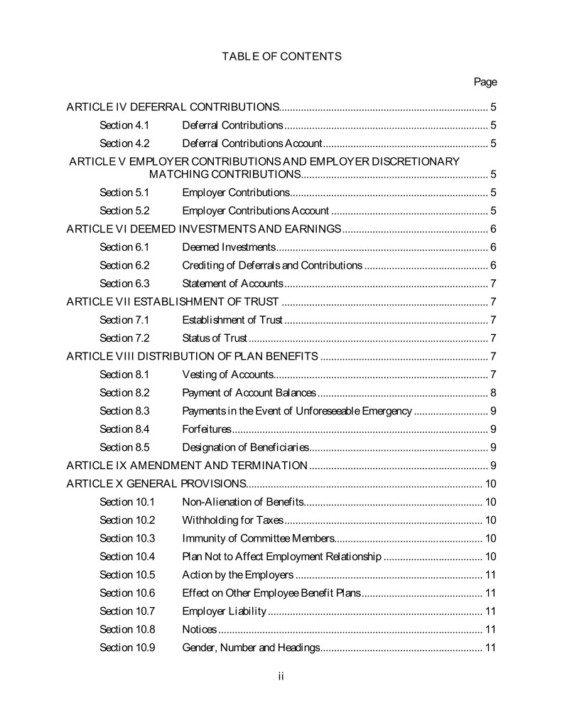 TABLE OF CONTENTS Page ARTICLE IV DEFERRAL CONTRIBUTIONS............................................................................ 5 Section 4.1 Deferral Contributions .......................................................................... 5 Section 4.2 Deferral Contributions Account ............................................................ 5 ARTICLE V EMPLOYER CONTRIBUTIONS AND EMPLOYER DISCRETIONARY MATCHING CONTRIBUTIONS .................................................................... 5 Section 5.1 Employer Contributions ........................................................................ 5 Section 5.2 Employer Contributions Account ......................................................... 5 ARTICLE VI DEEMED INVESTMENTS AND EARNINGS ..................................................... 6 Section 6.1 Deemed Investments ............................................................................. 6 Section 6.2 Crediting of Deferrals and Contributions ............................................. 6 Section 6.3 Statement of Accounts .......................................................................... 7 ARTICLE VII ESTABLISHMENT OF TRUST ........................................................................... 7 Section 7.1 Establishment of Trust .......................................................................... 7 Section 7.2 Status of Trust ....................................................................................... 7 ARTICLE VIII DISTRIBUTION OF PLAN BENEFITS ............................................................. 7 Section 8.1 Vesting of Accounts .............................................................................. 7 Section 8.2 Payment of Account Balances .............................................................. 8 Section 8.3 Payments in the Event of Unforeseeable Emergency ........................... 9 Section 8.4 Forfeitures ............................................................................................. 9 Section 8.5 Designation of Beneficiaries ................................................................. 9 ARTICLE IX AMENDMENT AND TERMINATION ................................................................. 9 ARTICLE X GENERAL PROVISIONS...................................................................................... 10 Section 10.1 Non-Alienation of Benefits ................................................................. 10 Section 10.2 Withholding for Taxes ........................................................................ 10 Section 10.3 Immunity of Committee Members...................................................... 10 Section 10.4 Plan Not to Affect Employment Relationship .................................... 10 Section 10.5 Action by the Employers .................................................................... 11 Section 10.6 Effect on Other Employee Benefit Plans ............................................ 11 Section 10.7 Employer Liability .............................................................................. 11 Section 10.8 Notices ................................................................................................ 11 Section 10.9 Gender, Number and Headings ........................................................... 11 ii