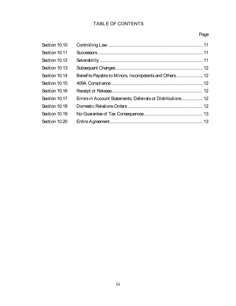 TABLE OF CONTENTS Page Section 10.10 Controlling Law .................................................................................. 11 Section 10.11 Successors ........................................................................................... 11 Section 10.12 Severability ......................................................................................... 11 Section 10.13 Subsequent Changes ........................................................................... 12 Section 10.14 Benefits Payable to Minors, Incompetents and Others ....................... 12 Section 10.15 409A Compliance ............................................................................... 12 Section 10.16 Receipt or Release............................................................................... 12 Section 10.17 Errors in Account Statements, Deferrals or Distributions .................. 12 Section 10.18 Domestic Relations Orders ................................................................. 12 Section 10.19 No Guarantee of Tax Consequences ................................................... 13 Section 10.20 Entire Agreement ................................................................................ 13 iii