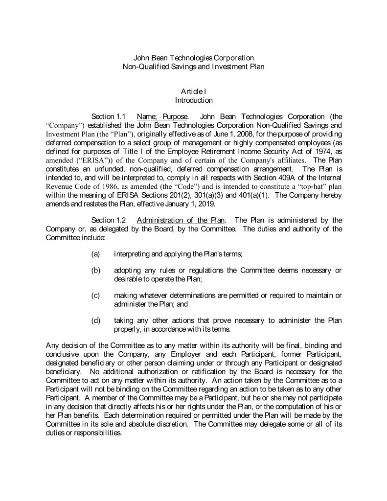 John Bean Technologies Corporation Non-Qualified Savings and Investment Plan Article I Introduction Section 1.1 Name; Purpose. John Bean Technologies Corporation (the “Company”) established the John Bean Technologies Corporation Non-Qualified Savings and Investment Plan (the “Plan”), originally effective as of June 1, 2008, for the purpose of providing deferred compensation to a select group of management or highly compensated employees (as defined for purposes of Title I of the Employee Retirement Income Security Act of 1974, as amended (“ERISA”)) of the Company and of certain of the Company's affiliates. The Plan constitutes an unfunded, non-qualified, deferred compensation arrangement. The Plan is intended to, and will be interpreted to, comply in all respects with Section 409A of the Internal Revenue Code of 1986, as amended (the “Code”) and is intended to constitute a “top-hat” plan within the meaning of ERISA Sections 201(2), 301(a)(3) and 401(a)(1). The Company hereby amends and restates the Plan, effective January 1, 2019. Section 1.2 Administration of the Plan. The Plan is administered by the Company or, as delegated by the Board, by the Committee. The duties and authority of the Committee include: (a) interpreting and applying the Plan's terms; (b) adopting any rules or regulations the Committee deems necessary or desirable to operate the Plan; (c) making whatever determinations are permitted or required to maintain or administer the Plan; and (d) taking any other actions that prove necessary to administer the Plan properly, in accordance with its terms. Any decision of the Committee as to any matter within its authority will be final, binding and conclusive upon the Company, any Employer and each Participant, former Participant, designated beneficiary or other person claiming under or through any Participant or designated beneficiary. No additional authorization or ratification by the Board is necessary for the Committee to act on any matter within its authority. An action taken by the Committee as to a Participant will not be binding on the Committee regarding an action to be taken as to any other Participant. A member of the Committee may be a Participant, but he or she may not participate in any decision that directly affects his or her rights under the Plan, or the computation of his or her Plan benefits. Each determination required or permitted under the Plan will be made by the Committee in its sole and absolute discretion. The Committee may delegate some or all of its duties or responsibilities.