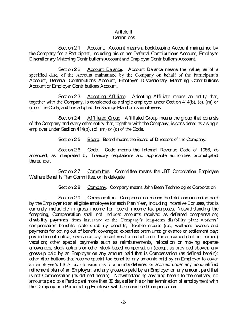 Article II Definitions Section 2.1 Account. Account means a bookkeeping Account maintained by the Company for a Participant, including his or her Deferral Contributions Account, Employer Discretionary Matching Contributions Account and Employer Contributions Account. Section 2.2 Account Balance. Account Balance means the value, as of a specified date, of the Account maintained by the Company on behalf of the Participant’s Account, Deferral Contributions Account, Employer Discretionary Matching Contributions Account or Employer Contributions Account. Section 2.3 Adopting Affiliate. Adopting Affiliate means an entity that, together with the Company, is considered as a single employer under Section 414(b), (c), (m) or (o) of the Code, and has adopted the Savings Plan for its employees. Section 2.4 Affiliated Group. Affiliated Group means the group that consists of the Company and every other entity that, together with the Company, is considered as a single employer under Section 414(b), (c), (m) or (o) of the Code. Section 2.5 Board. Board means the Board of Directors of the Company. Section 2.6 Code. Code means the Internal Revenue Code of 1986, as amended, as interpreted by Treasury regulations and applicable authorities promulgated thereunder. Section 2.7 Committee. Committee means the JBT Corporation Employee Welfare Benefits Plan Committee, or its delegate. Section 2.8 Company. Company means John Bean Technologies Corporation Section 2.9 Compensation. Compensation means the total compensation paid by the Employer to an eligible employee for each Plan Year, including Incentive Bonuses, that is currently includible in gross income for federal income tax purposes. Notwithstanding the foregoing, Compensation shall not include: amounts received as deferred compensation; disability payments from insurance or the Company’s long-term disability plan; workers’ compensation benefits; state disability benefits; flexible credits (i.e., wellness awards and payments for opting out of benefit coverage); expatriate premiums; grievance or settlement pay; pay in lieu of notice; severance pay; incentives for reduction in force accrued (but not earned) vacation; other special payments such as reimbursements, relocation or moving expense allowances; stock options or other stock-based compensation (except as provided above); any gross-up paid by an Employer on any amount paid that is Compensation (as defined herein); other distributions that receive special tax benefits; any amounts paid by an Employer to cover an employee’s FICA tax obligation as to amounts deferred or accrued under any nonqualified retirement plan of an Employer; and any gross-up paid by an Employer on any amount paid that is not Compensation (as defined herein). Notwithstanding anything herein to the contrary, no amounts paid to a Participant more than 30 days after his or her termination of employment with the Company or a Participating Employer will be considered Compensation. -2-