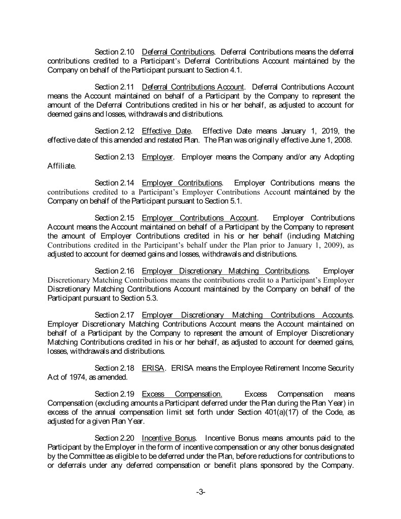 Section 2.10 Deferral Contributions. Deferral Contributions means the deferral contributions credited to a Participant’s Deferral Contributions Account maintained by the Company on behalf of the Participant pursuant to Section 4.1. Section 2.11 Deferral Contributions Account. Deferral Contributions Account means the Account maintained on behalf of a Participant by the Company to represent the amount of the Deferral Contributions credited in his or her behalf, as adjusted to account for deemed gains and losses, withdrawals and distributions. Section 2.12 Effective Date. Effective Date means January 1, 2019, the effective date of this amended and restated Plan. The Plan was originally effective June 1, 2008. Section 2.13 Employer. Employer means the Company and/or any Adopting Affiliate. Section 2.14 Employer Contributions. Employer Contributions means the contributions credited to a Participant’s Employer Contributions Account maintained by the Company on behalf of the Participant pursuant to Section 5.1. Section 2.15 Employer Contributions Account. Employer Contributions Account means the Account maintained on behalf of a Participant by the Company to represent the amount of Employer Contributions credited in his or her behalf (including Matching Contributions credited in the Participant’s behalf under the Plan prior to January 1, 2009), as adjusted to account for deemed gains and losses, withdrawals and distributions. Section 2.16 Employer Discretionary Matching Contributions. Employer Discretionary Matching Contributions means the contributions credit to a Participant’s Employer Discretionary Matching Contributions Account maintained by the Company on behalf of the Participant pursuant to Section 5.3. Section 2.17 Employer Discretionary Matching Contributions Accounts. Employer Discretionary Matching Contributions Account means the Account maintained on behalf of a Participant by the Company to represent the amount of Employer Discretionary Matching Contributions credited in his or her behalf, as adjusted to account for deemed gains, losses, withdrawals and distributions. Section 2.18 ERISA. ERISA means the Employee Retirement Income Security Act of 1974, as amended. Section 2.19 Excess Compensation. Excess Compensation means Compensation (excluding amounts a Participant deferred under the Plan during the Plan Year) in excess of the annual compensation limit set forth under Section 401(a)(17) of the Code, as adjusted for a given Plan Year. Section 2.20 Incentive Bonus. Incentive Bonus means amounts paid to the Participant by the Employer in the form of incentive compensation or any other bonus designated by the Committee as eligible to be deferred under the Plan, before reductions for contributions to or deferrals under any deferred compensation or benefit plans sponsored by the Company. -3-