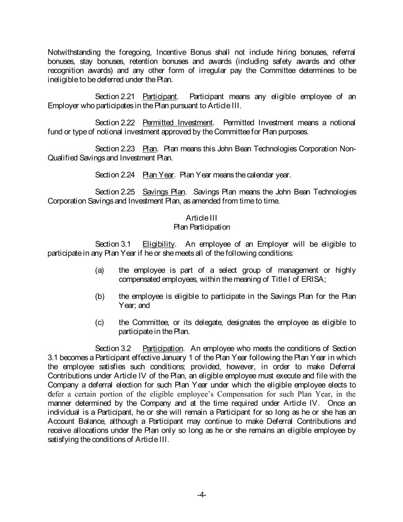 Notwithstanding the foregoing, Incentive Bonus shall not include hiring bonuses, referral bonuses, stay bonuses, retention bonuses and awards (including safety awards and other recognition awards) and any other form of irregular pay the Committee determines to be ineligible to be deferred under the Plan. Section 2.21 Participant. Participant means any eligible employee of an Employer who participates in the Plan pursuant to Article III. Section 2.22 Permitted Investment. Permitted Investment means a notional fund or type of notional investment approved by the Committee for Plan purposes. Section 2.23 Plan. Plan means this John Bean Technologies Corporation Non- Qualified Savings and Investment Plan. Section 2.24 Plan Year. Plan Year means the calendar year. Section 2.25 Savings Plan. Savings Plan means the John Bean Technologies Corporation Savings and Investment Plan, as amended from time to time. Article III Plan Participation Section 3.1 Eligibility. An employee of an Employer will be eligible to participate in any Plan Year if he or she meets all of the following conditions: (a) the employee is part of a select group of management or highly compensated employees, within the meaning of Title I of ERISA; (b) the employee is eligible to participate in the Savings Plan for the Plan Year; and (c) the Committee, or its delegate, designates the employee as eligible to participate in the Plan. Section 3.2 Participation. An employee who meets the conditions of Section 3.1 becomes a Participant effective January 1 of the Plan Year following the Plan Year in which the employee satisfies such conditions; provided, however, in order to make Deferral Contributions under Article IV of the Plan, an eligible employee must execute and file with the Company a deferral election for such Plan Year under which the eligible employee elects to defer a certain portion of the eligible employee’s Compensation for such Plan Year, in the manner determined by the Company and at the time required under Article IV. Once an individual is a Participant, he or she will remain a Participant for so long as he or she has an Account Balance, although a Participant may continue to make Deferral Contributions and receive allocations under the Plan only so long as he or she remains an eligible employee by satisfying the conditions of Article III. -4-