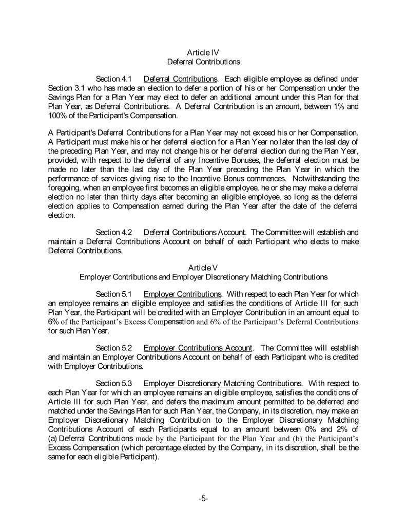 Article IV Deferral Contributions Section 4.1 Deferral Contributions. Each eligible employee as defined under Section 3.1 who has made an election to defer a portion of his or her Compensation under the Savings Plan for a Plan Year may elect to defer an additional amount under this Plan for that Plan Year, as Deferral Contributions. A Deferral Contribution is an amount, between 1% and 100% of the Participant's Compensation. A Participant's Deferral Contributions for a Plan Year may not exceed his or her Compensation. A Participant must make his or her deferral election for a Plan Year no later than the last day of the preceding Plan Year, and may not change his or her deferral election during the Plan Year, provided, with respect to the deferral of any Incentive Bonuses, the deferral election must be made no later than the last day of the Plan Year preceding the Plan Year in which the performance of services giving rise to the Incentive Bonus commences. Notwithstanding the foregoing, when an employee first becomes an eligible employee, he or she may make a deferral election no later than thirty days after becoming an eligible employee, so long as the deferral election applies to Compensation earned during the Plan Year after the date of the deferral election. Section 4.2 Deferral Contributions Account. The Committee will establish and maintain a Deferral Contributions Account on behalf of each Participant who elects to make Deferral Contributions. Article V Employer Contributions and Employer Discretionary Matching Contributions Section 5.1 Employer Contributions. With respect to each Plan Year for which an employee remains an eligible employee and satisfies the conditions of Article III for such Plan Year, the Participant will be credited with an Employer Contribution in an amount equal to 6% of the Participant’s Excess Compensation and 6% of the Participant’s Deferral Contributions for such Plan Year. Section 5.2 Employer Contributions Account. The Committee will establish and maintain an Employer Contributions Account on behalf of each Participant who is credited with Employer Contributions. Section 5.3 Employer Discretionary Matching Contributions. With respect to each Plan Year for which an employee remains an eligible employee, satisfies the conditions of Article III for such Plan Year, and defers the maximum amount permitted to be deferred and matched under the Savings Plan for such Plan Year, the Company, in its discretion, may make an Employer Discretionary Matching Contribution to the Employer Discretionary Matching Contributions Account of each Participants equal to an amount between 0% and 2% of (a) Deferral Contributions made by the Participant for the Plan Year and (b) the Participant’s Excess Compensation (which percentage elected by the Company, in its discretion, shall be the same for each eligible Participant). -5-