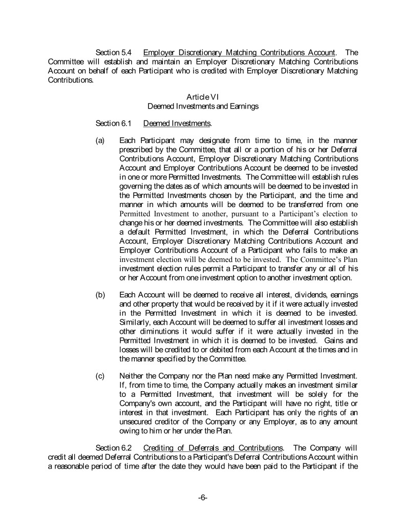 Section 5.4 Employer Discretionary Matching Contributions Account. The Committee will establish and maintain an Employer Discretionary Matching Contributions Account on behalf of each Participant who is credited with Employer Discretionary Matching Contributions. Article VI Deemed Investments and Earnings Section 6.1 Deemed Investments. (a) Each Participant may designate from time to time, in the manner prescribed by the Committee, that all or a portion of his or her Deferral Contributions Account, Employer Discretionary Matching Contributions Account and Employer Contributions Account be deemed to be invested in one or more Permitted Investments. The Committee will establish rules governing the dates as of which amounts will be deemed to be invested in the Permitted Investments chosen by the Participant, and the time and manner in which amounts will be deemed to be transferred from one Permitted Investment to another, pursuant to a Participant’s election to change his or her deemed investments. The Committee will also establish a default Permitted Investment, in which the Deferral Contributions Account, Employer Discretionary Matching Contributions Account and Employer Contributions Account of a Participant who fails to make an investment election will be deemed to be invested. The Committee’s Plan investment election rules permit a Participant to transfer any or all of his or her Account from one investment option to another investment option. (b) Each Account will be deemed to receive all interest, dividends, earnings and other property that would be received by it if it were actually invested in the Permitted Investment in which it is deemed to be invested. Similarly, each Account will be deemed to suffer all investment losses and other diminutions it would suffer if it were actually invested in the Permitted Investment in which it is deemed to be invested. Gains and losses will be credited to or debited from each Account at the times and in the manner specified by the Committee. (c) Neither the Company nor the Plan need make any Permitted Investment. If, from time to time, the Company actually makes an investment similar to a Permitted Investment, that investment will be solely for the Company's own account, and the Participant will have no right, title or interest in that investment. Each Participant has only the rights of an unsecured creditor of the Company or any Employer, as to any amount owing to him or her under the Plan. Section 6.2 Crediting of Deferrals and Contributions. The Company will credit all deemed Deferral Contributions to a Participant's Deferral Contributions Account within a reasonable period of time after the date they would have been paid to the Participant if the -6-