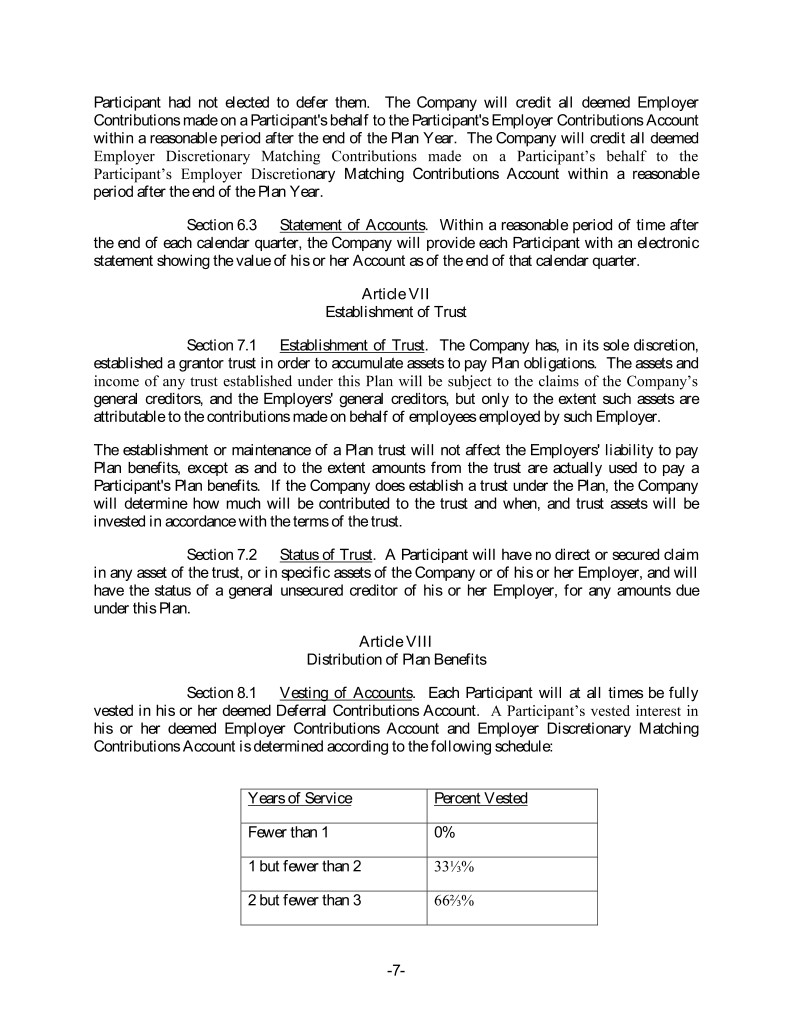 Participant had not elected to defer them. The Company will credit all deemed Employer Contributions made on a Participant's behalf to the Participant's Employer Contributions Account within a reasonable period after the end of the Plan Year. The Company will credit all deemed Employer Discretionary Matching Contributions made on a Participant’s behalf to the Participant’s Employer Discretionary Matching Contributions Account within a reasonable period after the end of the Plan Year. Section 6.3 Statement of Accounts. Within a reasonable period of time after the end of each calendar quarter, the Company will provide each Participant with an electronic statement showing the value of his or her Account as of the end of that calendar quarter. Article VII Establishment of Trust Section 7.1 Establishment of Trust. The Company has, in its sole discretion, established a grantor trust in order to accumulate assets to pay Plan obligations. The assets and income of any trust established under this Plan will be subject to the claims of the Company’s general creditors, and the Employers' general creditors, but only to the extent such assets are attributable to the contributions made on behalf of employees employed by such Employer. The establishment or maintenance of a Plan trust will not affect the Employers' liability to pay Plan benefits, except as and to the extent amounts from the trust are actually used to pay a Participant's Plan benefits. If the Company does establish a trust under the Plan, the Company will determine how much will be contributed to the trust and when, and trust assets will be invested in accordance with the terms of the trust. Section 7.2 Status of Trust. A Participant will have no direct or secured claim in any asset of the trust, or in specific assets of the Company or of his or her Employer, and will have the status of a general unsecured creditor of his or her Employer, for any amounts due under this Plan. Article VIII Distribution of Plan Benefits Section 8.1 Vesting of Accounts. Each Participant will at all times be fully vested in his or her deemed Deferral Contributions Account. A Participant’s vested interest in his or her deemed Employer Contributions Account and Employer Discretionary Matching Contributions Account is determined according to the following schedule: Years of Service Percent Vested Fewer than 1 0% 1 but fewer than 2 33⅓% 2 but fewer than 3 66⅔% -7-