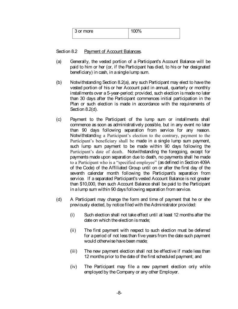 3 or more 100% Section 8.2 Payment of Account Balances. (a) Generally, the vested portion of a Participant's Account Balance will be paid to him or her (or, if the Participant has died, to his or her designated beneficiary) in cash, in a single lump sum. (b) Notwithstanding Section 8.2(a), any such Participant may elect to have the vested portion of his or her Account paid in annual, quarterly or monthly installments over a 5-year-period; provided, such election is made no later than 30 days after the Participant commences initial participation in the Plan or such election is made in accordance with the requirements of Section 8.2(d). (c) Payment to the Participant of the lump sum or installments shall commence as soon as administratively possible, but in any event no later than 90 days following separation from service for any reason. Notwithstanding a Participant’s election to the contrary, payment to the Participant’s beneficiary shall be made in a single lump sum payment, such lump sum payment to be made within 90 days following the Participant’s date of death. Notwithstanding the foregoing, except for payments made upon separation due to death, no payments shall he made to a Participant who is a “specified employee” (as defined in Section 409A of the Code) of the Affiliated Group until on or after the first day of the seventh calendar month following the Participant's separation from service. If a separated Participant's vested Account Balance is not greater than $10,000, then such Account Balance shall be paid to the Participant in a lump sum within 90 days following separation from service. (d) A Participant may change the form and time of payment that he or she previously elected, by notice filed with the Administrator provided: (i) Such election shall not take effect until at least 12 months after the date on which the election is made; (ii) The first payment with respect to such election must be deferred for a period of not less than five years from the date such payment would otherwise have been made; (iii) The new payment election shall not be effective if made less than 12 months prior to the date of the first scheduled payment; and (iv) The Participant may file a new payment election only while employed by the Company or any other Employer. -8-