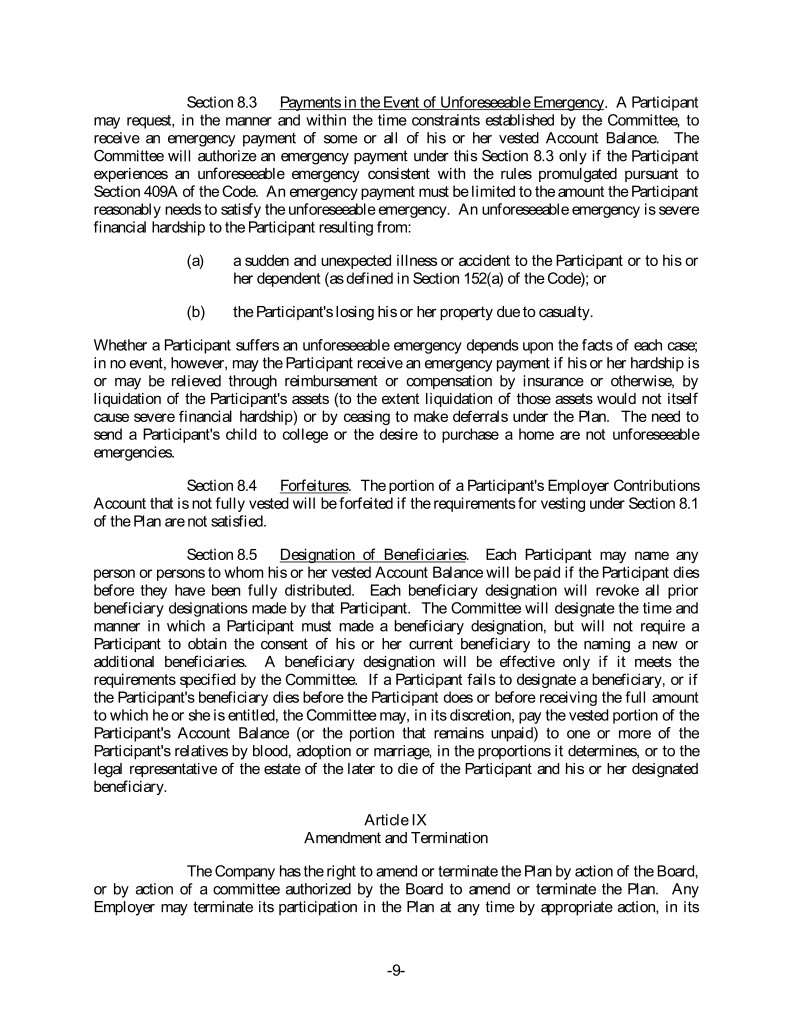 Section 8.3 Payments in the Event of Unforeseeable Emergency. A Participant may request, in the manner and within the time constraints established by the Committee, to receive an emergency payment of some or all of his or her vested Account Balance. The Committee will authorize an emergency payment under this Section 8.3 only if the Participant experiences an unforeseeable emergency consistent with the rules promulgated pursuant to Section 409A of the Code. An emergency payment must be limited to the amount the Participant reasonably needs to satisfy the unforeseeable emergency. An unforeseeable emergency is severe financial hardship to the Participant resulting from: (a) a sudden and unexpected illness or accident to the Participant or to his or her dependent (as defined in Section 152(a) of the Code); or (b) the Participant's losing his or her property due to casualty. Whether a Participant suffers an unforeseeable emergency depends upon the facts of each case; in no event, however, may the Participant receive an emergency payment if his or her hardship is or may be relieved through reimbursement or compensation by insurance or otherwise, by liquidation of the Participant's assets (to the extent liquidation of those assets would not itself cause severe financial hardship) or by ceasing to make deferrals under the Plan. The need to send a Participant's child to college or the desire to purchase a home are not unforeseeable emergencies. Section 8.4 Forfeitures. The portion of a Participant's Employer Contributions Account that is not fully vested will be forfeited if the requirements for vesting under Section 8.1 of the Plan are not satisfied. Section 8.5 Designation of Beneficiaries. Each Participant may name any person or persons to whom his or her vested Account Balance will be paid if the Participant dies before they have been fully distributed. Each beneficiary designation will revoke all prior beneficiary designations made by that Participant. The Committee will designate the time and manner in which a Participant must made a beneficiary designation, but will not require a Participant to obtain the consent of his or her current beneficiary to the naming a new or additional beneficiaries. A beneficiary designation will be effective only if it meets the requirements specified by the Committee. If a Participant fails to designate a beneficiary, or if the Participant's beneficiary dies before the Participant does or before receiving the full amount to which he or she is entitled, the Committee may, in its discretion, pay the vested portion of the Participant's Account Balance (or the portion that remains unpaid) to one or more of the Participant's relatives by blood, adoption or marriage, in the proportions it determines, or to the legal representative of the estate of the later to die of the Participant and his or her designated beneficiary. Article IX Amendment and Termination The Company has the right to amend or terminate the Plan by action of the Board, or by action of a committee authorized by the Board to amend or terminate the Plan. Any Employer may terminate its participation in the Plan at any time by appropriate action, in its -9-