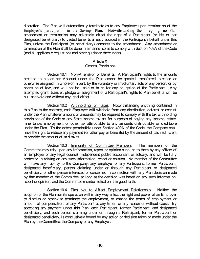 discretion. The Plan will automatically terminate as to any Employer upon termination of the Employer’s participation in the Savings Plan. Notwithstanding the foregoing, no Plan amendment or termination may adversely affect the right of a Participant (or his or her designated beneficiary) to vested benefits already accrued in the Participant's behalf under this Plan, unless the Participant (or beneficiary) consents to the amendment. Any amendment or termination of the Plan shall be done in a manner so as to comply with Section 409A of the Code (and all applicable regulations and other guidance thereunder). Article X General Provisions Section 10.1 Non-Alienation of Benefits. A Participant's rights to the amounts credited to his or her Account under the Plan cannot be granted, transferred, pledged or otherwise assigned, in whole or in part, by the voluntary or involuntary acts of any person, or by operation of law, and will not be liable or taken for any obligation of the Participant. Any attempted grant, transfer, pledge or assignment of a Participant's rights to Plan benefits will be null and void and without any legal effect. Section 10.2 Withholding for Taxes. Notwithstanding anything contained in this Plan to the contrary, each Employer will withhold from any distribution, deferral or accrual under the Plan whatever amount or amounts may be required to comply with the tax withholding provisions of the Code or any State income tax act for purposes of paying any income, estate, inheritance, employment or other tax attributable to any amounts distributable or creditable under the Plan. To the extent permissible under Section 409A of the Code, the Company shall have the right to reduce any payment (or other pay or benefits) by the amount of cash sufficient to provide the amount of said taxes. Section 10.3 Immunity of Committee Members. The members of the Committee may rely upon any information, report or opinion supplied to them by any officer of an Employer or any legal counsel, independent public accountant or actuary, and will be fully protected in relying on any such information, report or opinion. No member of the Committee will have any liability to the Company, any Employer or any Participant, former Participant, designated beneficiary, person claiming under or through any Participant or designated beneficiary, or other person interested or concerned in connection with any Plan decision made by that member of the Committee, so long as the decision was based on any such information, report or opinion, and the Committee member relied on it in good faith. Section 10.4 Plan Not to Affect Employment Relationship. Neither the adoption of the Plan nor its operation will in any way affect the right and power of an Employer to dismiss or otherwise terminate the employment, or change the terms of employment or amount of compensation, of any Participant at any time, for any reason or without cause. By accepting any payment under this Plan, each Participant, former Participant, and designated beneficiary, and each person claiming under or through a Participant, former Participant or designated beneficiary, is conclusively bound by any action or decision taken or made under the Plan by the Committee, the Company or any Employer. -10-