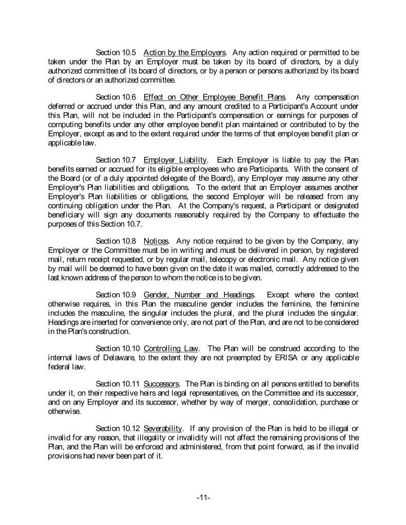 Section 10.5 Action by the Employers. Any action required or permitted to be taken under the Plan by an Employer must be taken by its board of directors, by a duly authorized committee of its board of directors, or by a person or persons authorized by its board of directors or an authorized committee. Section 10.6 Effect on Other Employee Benefit Plans. Any compensation deferred or accrued under this Plan, and any amount credited to a Participant's Account under this Plan, will not be included in the Participant's compensation or earnings for purposes of computing benefits under any other employee benefit plan maintained or contributed to by the Employer, except as and to the extent required under the terms of that employee benefit plan or applicable law. Section 10.7 Employer Liability. Each Employer is liable to pay the Plan benefits earned or accrued for its eligible employees who are Participants. With the consent of the Board (or of a duly appointed delegate of the Board), any Employer may assume any other Employer's Plan liabilities and obligations. To the extent that an Employer assumes another Employer's Plan liabilities or obligations, the second Employer will be released from any continuing obligation under the Plan. At the Company's request, a Participant or designated beneficiary will sign any documents reasonably required by the Company to effectuate the purposes of this Section 10.7. Section 10.8 Notices. Any notice required to be given by the Company, any Employer or the Committee must be in writing and must be delivered in person, by registered mail, return receipt requested, or by regular mail, telecopy or electronic mail. Any notice given by mail will be deemed to have been given on the date it was mailed, correctly addressed to the last known address of the person to whom the notice is to be given. Section 10.9 Gender, Number and Headings. Except where the context otherwise requires, in this Plan the masculine gender includes the feminine, the feminine includes the masculine, the singular includes the plural, and the plural includes the singular. Headings are inserted for convenience only, are not part of the Plan, and are not to be considered in the Plan's construction. Section 10.10 Controlling Law. The Plan will be construed according to the internal laws of Delaware, to the extent they are not preempted by ERISA or any applicable federal law. Section 10.11 Successors. The Plan is binding on all persons entitled to benefits under it, on their respective heirs and legal representatives, on the Committee and its successor, and on any Employer and its successor, whether by way of merger, consolidation, purchase or otherwise. Section 10.12 Severability. If any provision of the Plan is held to be illegal or invalid for any reason, that illegality or invalidity will not affect the remaining provisions of the Plan, and the Plan will be enforced and administered, from that point forward, as if the invalid provisions had never been part of it. -11-