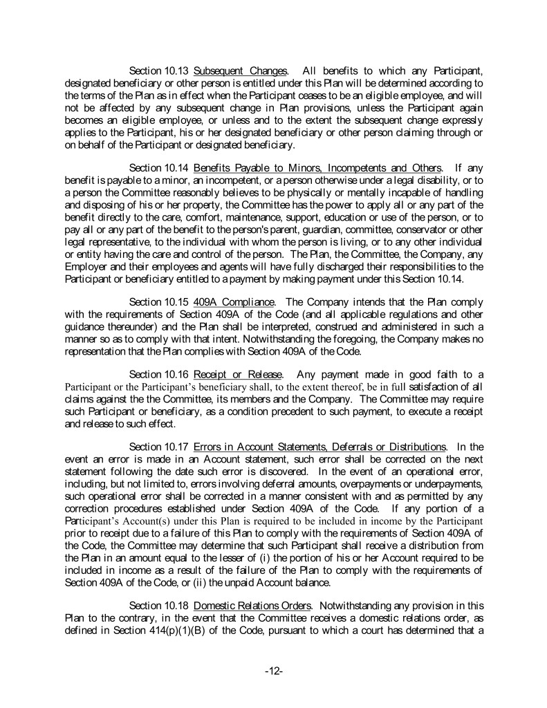 Section 10.13 Subsequent Changes. All benefits to which any Participant, designated beneficiary or other person is entitled under this Plan will be determined according to the terms of the Plan as in effect when the Participant ceases to be an eligible employee, and will not be affected by any subsequent change in Plan provisions, unless the Participant again becomes an eligible employee, or unless and to the extent the subsequent change expressly applies to the Participant, his or her designated beneficiary or other person claiming through or on behalf of the Participant or designated beneficiary. Section 10.14 Benefits Payable to Minors, Incompetents and Others. If any benefit is payable to a minor, an incompetent, or a person otherwise under a legal disability, or to a person the Committee reasonably believes to be physically or mentally incapable of handling and disposing of his or her property, the Committee has the power to apply all or any part of the benefit directly to the care, comfort, maintenance, support, education or use of the person, or to pay all or any part of the benefit to the person's parent, guardian, committee, conservator or other legal representative, to the individual with whom the person is living, or to any other individual or entity having the care and control of the person. The Plan, the Committee, the Company, any Employer and their employees and agents will have fully discharged their responsibilities to the Participant or beneficiary entitled to a payment by making payment under this Section 10.14. Section 10.15 409A Compliance. The Company intends that the Plan comply with the requirements of Section 409A of the Code (and all applicable regulations and other guidance thereunder) and the Plan shall be interpreted, construed and administered in such a manner so as to comply with that intent. Notwithstanding the foregoing, the Company makes no representation that the Plan complies with Section 409A of the Code. Section 10.16 Receipt or Release. Any payment made in good faith to a Participant or the Participant’s beneficiary shall, to the extent thereof, be in full satisfaction of all claims against the the Committee, its members and the Company. The Committee may require such Participant or beneficiary, as a condition precedent to such payment, to execute a receipt and release to such effect. Section 10.17 Errors in Account Statements, Deferrals or Distributions. In the event an error is made in an Account statement, such error shall be corrected on the next statement following the date such error is discovered. In the event of an operational error, including, but not limited to, errors involving deferral amounts, overpayments or underpayments, such operational error shall be corrected in a manner consistent with and as permitted by any correction procedures established under Section 409A of the Code. If any portion of a Participant’s Account(s) under this Plan is required to be included in income by the Participant prior to receipt due to a failure of this Plan to comply with the requirements of Section 409A of the Code, the Committee may determine that such Participant shall receive a distribution from the Plan in an amount equal to the lesser of (i) the portion of his or her Account required to be included in income as a result of the failure of the Plan to comply with the requirements of Section 409A of the Code, or (ii) the unpaid Account balance. Section 10.18 Domestic Relations Orders. Notwithstanding any provision in this Plan to the contrary, in the event that the Committee receives a domestic relations order, as defined in Section 414(p)(1)(B) of the Code, pursuant to which a court has determined that a -12-