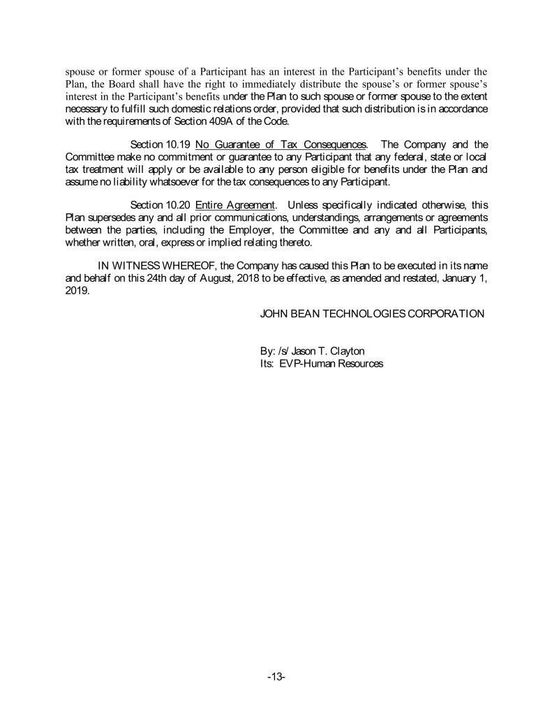 spouse or former spouse of a Participant has an interest in the Participant’s benefits under the Plan, the Board shall have the right to immediately distribute the spouse’s or former spouse’s interest in the Participant’s benefits under the Plan to such spouse or former spouse to the extent necessary to fulfill such domestic relations order, provided that such distribution is in accordance with the requirements of Section 409A of the Code. Section 10.19 No Guarantee of Tax Consequences. The Company and the Committee make no commitment or guarantee to any Participant that any federal, state or local tax treatment will apply or be available to any person eligible for benefits under the Plan and assume no liability whatsoever for the tax consequences to any Participant. Section 10.20 Entire Agreement. Unless specifically indicated otherwise, this Plan supersedes any and all prior communications, understandings, arrangements or agreements between the parties, including the Employer, the Committee and any and all Participants, whether written, oral, express or implied relating thereto. IN WITNESS WHEREOF, the Company has caused this Plan to be executed in its name and behalf on this 24th day of August, 2018 to be effective, as amended and restated, January 1, 2019. JOHN BEAN TECHNOLOGIES CORPORATION By: /s/ Jason T. Clayton Its: EVP-Human Resources -13-