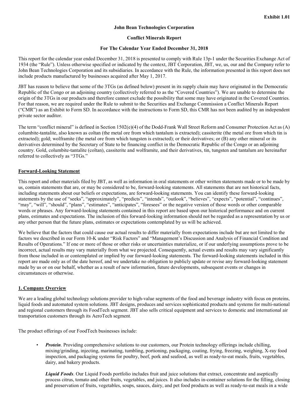 Exhibit 1.01 John Bean Technologies Corporation Conflict Minerals Report For The Calendar Year Ended December 31, 2018 This report for the calendar year ended December 31, 2018 is presented to comply with Rule 13p-1 under the Securities Exchange Act of 1934 (the “Rule”). Unless otherwise specified or indicated by the context, JBT Corporation, JBT, we, us, our and the Company refer to John Bean Technologies Corporation and its subsidiaries. In accordance with the Rule, the information presented in this report does not include products manufactured by businesses acquired after May 1, 2017. JBT has reason to believe that some of the 3TGs (as defined below) present in its supply chain may have originated in the Democratic Republic of the Congo or an adjoining country (collectively referred to as the “Covered Countries”). We are unable to determine the origin of the 3TGs in our products and therefore cannot exclude the possibility that some may have originated in the Covered Countries. For that reason, we are required under the Rule to submit to the Securities and Exchange Commission a Conflict Minerals Report (“CMR”) as an Exhibit to Form SD. In accordance with the instructions to Form SD, this CMR has not been audited by an independent private sector auditor. The term “conflict mineral” is defined in Section 1502(e)(4) of the Dodd-Frank Wall Street Reform and Consumer Protection Act as (A) columbite-tantalite, also known as coltan (the metal ore from which tantalum is extracted); cassiterite (the metal ore from which tin is extracted); gold; wolframite (the metal ore from which tungsten is extracted); or their derivatives; or (B) any other mineral or its derivatives determined by the Secretary of State to be financing conflict in the Democratic Republic of the Congo or an adjoining country. Gold, columbite-tantalite (coltan), cassiterite and wolframite, and their derivatives, tin, tungsten and tantalum are hereinafter referred to collectively as “3TGs.” Forward-Looking Statement This report and other materials filed by JBT, as well as information in oral statements or other written statements made or to be made by us, contain statements that are, or may be considered to be, forward-looking statements. All statements that are not historical facts, including statements about our beliefs or expectations, are forward-looking statements. You can identify these forward-looking statements by the use of “seeks”, “approximately”, “predicts”, “intends”, “outlook”, “believes”, “expects”, “potential”, “continues”, “may”, “will”, “should”, “plans”, “estimates”, “anticipates”, “foresees” or the negative version of those words or other comparable words or phrases. Any forward-looking statements contained in this report are based upon our historical performance and on current plans, estimates and expectations. The inclusion of this forward-looking information should not be regarded as a representation by us or any other person that the future plans, estimates or expectations contemplated by us will be achieved. We believe that the factors that could cause our actual results to differ materially from expectations include but are not limited to the factors we described in our Form 10-K under “Risk Factors” and “Management’s Discussion and Analysis of Financial Condition and Results of Operations.” If one or more of those or other risks or uncertainties materialize, or if our underlying assumptions prove to be incorrect, actual results may vary materially from what we projected. Consequently, actual events and results may vary significantly from those included in or contemplated or implied by our forward-looking statements. The forward-looking statements included in this report are made only as of the date hereof, and we undertake no obligation to publicly update or revise any forward-looking statement made by us or on our behalf, whether as a result of new information, future developments, subsequent events or changes in circumstances or otherwise. 1. Company Overview We are a leading global technology solutions provider to high-value segments of the food and beverage industry with focus on proteins, liquid foods and automated system solutions. JBT designs, produces and services sophisticated products and systems for multi-national and regional customers through its FoodTech segment. JBT also sells critical equipment and services to domestic and international air transportation customers through its AeroTech segment. The product offerings of our FoodTech businesses include: • Protein. Providing comprehensive solutions to our customers, our Protein technology offerings include chilling, mixing/grinding, injecting, marinating, tumbling, portioning, packaging, coating, frying, freezing, weighing, X-ray food inspection, and packaging systems for poultry, beef, pork and seafood, as well as ready-to-eat meals, fruits, vegetables, dairy, and bakery products. Liquid Foods. Our Liquid Foods portfolio includes fruit and juice solutions that extract, concentrate and aseptically process citrus, tomato and other fruits, vegetables, and juices. It also includes in-container solutions for the filling, closing and preservation of fruits, vegetables, soups, sauces, dairy, and pet food products as well as ready-to-eat meals in a wide