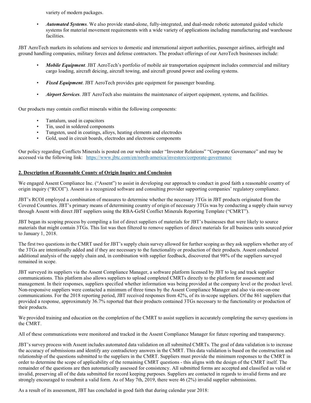 variety of modern packages. • Automated Systems. We also provide stand-alone, fully-integrated, and dual-mode robotic automated guided vehicle systems for material movement requirements with a wide variety of applications including manufacturing and warehouse facilities. JBT AeroTech markets its solutions and services to domestic and international airport authorities, passenger airlines, airfreight and ground handling companies, military forces and defense contractors. The product offerings of our AeroTech businesses include: • Mobile Equipment. JBT AeroTech’s portfolio of mobile air transportation equipment includes commercial and military cargo loading, aircraft deicing, aircraft towing, and aircraft ground power and cooling systems. • Fixed Equipment. JBT AeroTech provides gate equipment for passenger boarding. • Airport Services. JBT AeroTech also maintains the maintenance of airport equipment, systems, and facilities. Our products may contain conflict minerals within the following components: • Tantalum, used in capacitors • Tin, used in soldered components • Tungsten, used in coatings, alloys, heating elements and electrodes • Gold, used in circuit boards, electrodes and electronic components Our policy regarding Conflicts Minerals is posted on our website under “Investor Relations” “Corporate Governance” and may be accessed via the following link: https://www.jbtc.com/en/north-america/investors/corporate-governance 2. Description of Reasonable County of Origin Inquiry and Conclusion We engaged Assent Compliance Inc. (“Assent”) to assist in developing our approach to conduct in good faith a reasonable country of origin inquiry (“RCOI”). Assent is a recognized software and consulting provider supporting companies’ regulatory compliance. JBT’s RCOI employed a combination of measures to determine whether the necessary 3TGs in JBT products originated from the Covered Countries. JBT’s primary means of determining country of origin of necessary 3TGs was by conducting a supply chain survey through Assent with direct JBT suppliers using the RBA-GeSI Conflict Minerals Reporting Template (“CMRT”). JBT began its scoping process by compiling a list of direct suppliers of materials for JBT’s businesses that were likely to source materials that might contain 3TGs. This list was then filtered to remove suppliers of direct materials for all business units sourced prior to January 1, 2018. The first two questions in the CMRT used for JBT’s supply chain survey allowed for further scoping as they ask suppliers whether any of the 3TGs are intentionally added and if they are necessary to the functionality or production of their products. Assent conducted additional analysis of the supply chain and, in combination with supplier feedback, discovered that 98% of the suppliers surveyed remained in scope. JBT surveyed its suppliers via the Assent Compliance Manager, a software platform licensed by JBT to log and track supplier communications. This platform also allows suppliers to upload completed CMRTs directly to the platform for assessment and management. In their responses, suppliers specified whether information was being provided at the company level or the product level. Non-responsive suppliers were contacted a minimum of three times by the Assent Compliance Manager and also via one-on-one communications. For the 2018 reporting period, JBT received responses from 42%, of its in-scope suppliers. Of the 861 suppliers that provided a response, approximately 36.7% reported that their products contained 3TGs necessary to the functionality or production of their products. We provided training and education on the completion of the CMRT to assist suppliers in accurately completing the survey questions in the CMRT. All of these communications were monitored and tracked in the Assent Compliance Manager for future reporting and transparency. JBT’s survey process with Assent includes automated data validation on all submitted CMRTs. The goal of data validation is to increase the accuracy of submissions and identify any contradictory answers in the CMRT. This data validation is based on the construction and relationship of the questions submitted to the suppliers in the CMRT. Suppliers must provide the minimum responses to the CMRT in order to determine the scope of applicability of the remaining CMRT questions - this aligns with the design of the CMRT itself. The remainder of the questions are then automatically assessed for consistency. All submitted forms are accepted and classified as valid or invalid, preserving all of the data submitted for record keeping purposes. Suppliers are contacted in regards to invalid forms and are strongly encouraged to resubmit a valid form. As of May 7th, 2019, there were 46 (2%) invalid supplier submissions. As a result of its assessment, JBT has concluded in good faith that during calendar year 2018: