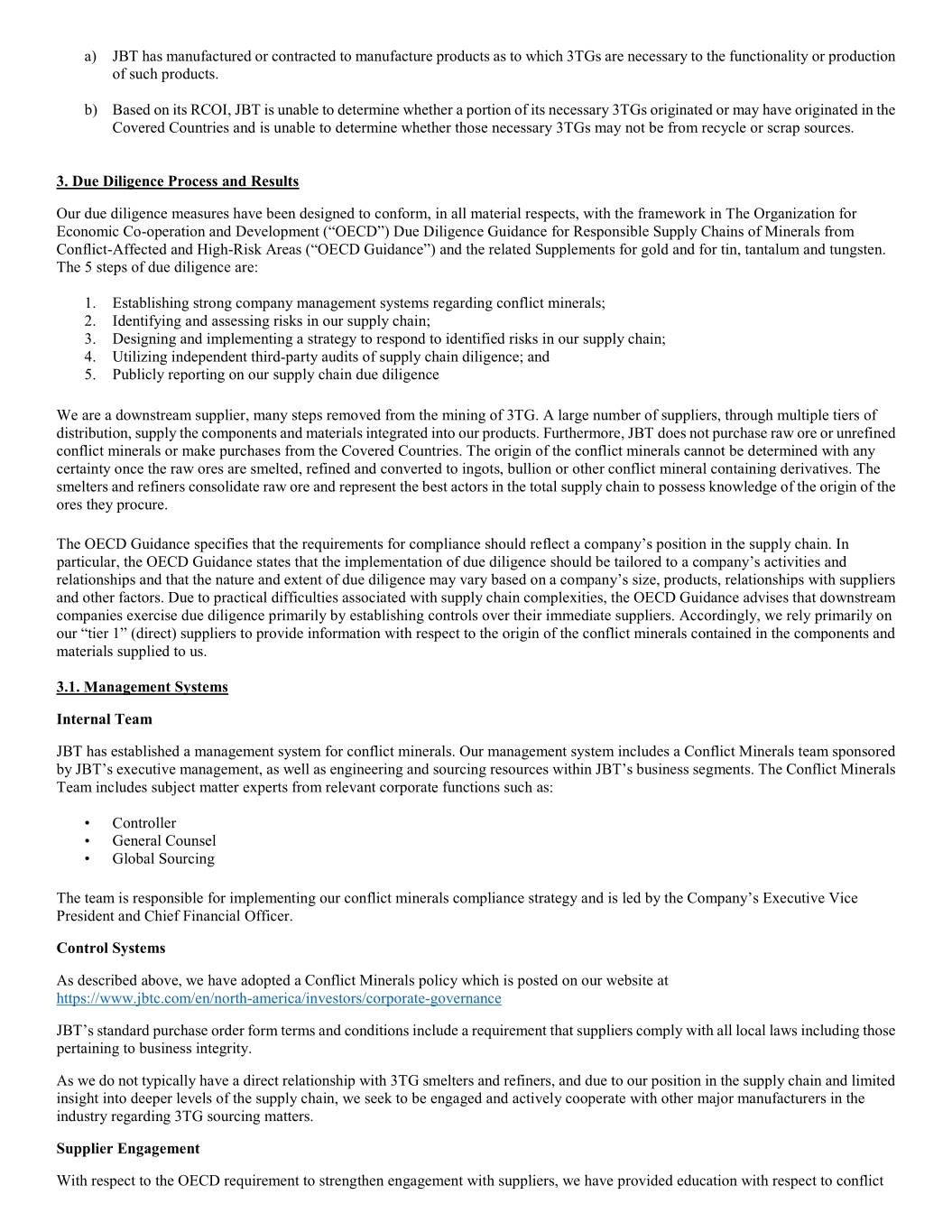 a) JBT has manufactured or contracted to manufacture products as to which 3TGs are necessary to the functionality or production of such products. b) Based on its RCOI, JBT is unable to determine whether a portion of its necessary 3TGs originated or may have originated in the Covered Countries and is unable to determine whether those necessary 3TGs may not be from recycle or scrap sources. 3. Due Diligence Process and Results Our due diligence measures have been designed to conform, in all material respects, with the framework in The Organization for Economic Co-operation and Development (“OECD”) Due Diligence Guidance for Responsible Supply Chains of Minerals from Conflict-Affected and High-Risk Areas (“OECD Guidance”) and the related Supplements for gold and for tin, tantalum and tungsten. The 5 steps of due diligence are: 1. Establishing strong company management systems regarding conflict minerals; 2. Identifying and assessing risks in our supply chain; 3. Designing and implementing a strategy to respond to identified risks in our supply chain; 4. Utilizing independent third-party audits of supply chain diligence; and 5. Publicly reporting on our supply chain due diligence We are a downstream supplier, many steps removed from the mining of 3TG. A large number of suppliers, through multiple tiers of distribution, supply the components and materials integrated into our products. Furthermore, JBT does not purchase raw ore or unrefined conflict minerals or make purchases from the Covered Countries. The origin of the conflict minerals cannot be determined with any certainty once the raw ores are smelted, refined and converted to ingots, bullion or other conflict mineral containing derivatives. The smelters and refiners consolidate raw ore and represent the best actors in the total supply chain to possess knowledge of the origin of the ores they procure. The OECD Guidance specifies that the requirements for compliance should reflect a company’s position in the supply chain. In particular, the OECD Guidance states that the implementation of due diligence should be tailored to a company’s activities and relationships and that the nature and extent of due diligence may vary based on a company’s size, products, relationships with suppliers and other factors. Due to practical difficulties associated with supply chain complexities, the OECD Guidance advises that downstream companies exercise due diligence primarily by establishing controls over their immediate suppliers. Accordingly, we rely primarily on our “tier 1” (direct) suppliers to provide information with respect to the origin of the conflict minerals contained in the components and materials supplied to us. 3.1. Management Systems Internal Team JBT has established a management system for conflict minerals. Our management system includes a Conflict Minerals team sponsored by JBT’s executive management, as well as engineering and sourcing resources within JBT’s business segments. The Conflict Minerals Team includes subject matter experts from relevant corporate functions such as: • Controller • General Counsel • Global Sourcing The team is responsible for implementing our conflict minerals compliance strategy and is led by the Company’s Executive Vice President and Chief Financial Officer. Control Systems As described above, we have adopted a Conflict Minerals policy which is posted on our website at https://www.jbtc.com/en/north-america/investors/corporate-governance JBT’s standard purchase order form terms and conditions include a requirement that suppliers comply with all local laws including those pertaining to business integrity. As we do not typically have a direct relationship with 3TG smelters and refiners, and due to our position in the supply chain and limited insight into deeper levels of the supply chain, we seek to be engaged and actively cooperate with other major manufacturers in the industry regarding 3TG sourcing matters. Supplier Engagement With respect to the OECD requirement to strengthen engagement with suppliers, we have provided education with respect to conflict