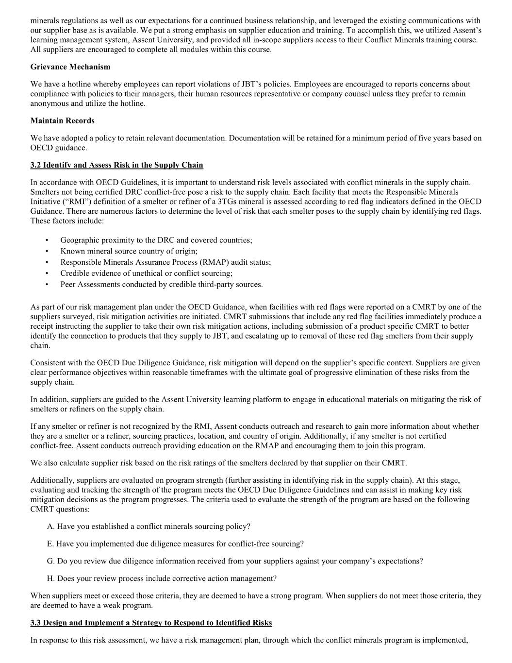 minerals regulations as well as our expectations for a continued business relationship, and leveraged the existing communications with our supplier base as is available. We put a strong emphasis on supplier education and training. To accomplish this, we utilized Assent’s learning management system, Assent University, and provided all in-scope suppliers access to their Conflict Minerals training course. All suppliers are encouraged to complete all modules within this course. Grievance Mechanism We have a hotline whereby employees can report violations of JBT’s policies. Employees are encouraged to reports concerns about compliance with policies to their managers, their human resources representative or company counsel unless they prefer to remain anonymous and utilize the hotline. Maintain Records We have adopted a policy to retain relevant documentation. Documentation will be retained for a minimum period of five years based on OECD guidance. 3.2 Identify and Assess Risk in the Supply Chain In accordance with OECD Guidelines, it is important to understand risk levels associated with conflict minerals in the supply chain. Smelters not being certified DRC conflict-free pose a risk to the supply chain. Each facility that meets the Responsible Minerals Initiative (“RMI”) definition of a smelter or refiner of a 3TGs mineral is assessed according to red flag indicators defined in the OECD Guidance. There are numerous factors to determine the level of risk that each smelter poses to the supply chain by identifying red flags. These factors include: • Geographic proximity to the DRC and covered countries; • Known mineral source country of origin; • Responsible Minerals Assurance Process (RMAP) audit status; • Credible evidence of unethical or conflict sourcing; • Peer Assessments conducted by credible third-party sources. As part of our risk management plan under the OECD Guidance, when facilities with red flags were reported on a CMRT by one of the suppliers surveyed, risk mitigation activities are initiated. CMRT submissions that include any red flag facilities immediately produce a receipt instructing the supplier to take their own risk mitigation actions, including submission of a product specific CMRT to better identify the connection to products that they supply to JBT, and escalating up to removal of these red flag smelters from their supply chain. Consistent with the OECD Due Diligence Guidance, risk mitigation will depend on the supplier’s specific context. Suppliers are given clear performance objectives within reasonable timeframes with the ultimate goal of progressive elimination of these risks from the supply chain. In addition, suppliers are guided to the Assent University learning platform to engage in educational materials on mitigating the risk of smelters or refiners on the supply chain. If any smelter or refiner is not recognized by the RMI, Assent conducts outreach and research to gain more information about whether they are a smelter or a refiner, sourcing practices, location, and country of origin. Additionally, if any smelter is not certified conflict-free, Assent conducts outreach providing education on the RMAP and encouraging them to join this program. We also calculate supplier risk based on the risk ratings of the smelters declared by that supplier on their CMRT. Additionally, suppliers are evaluated on program strength (further assisting in identifying risk in the supply chain). At this stage, evaluating and tracking the strength of the program meets the OECD Due Diligence Guidelines and can assist in making key risk mitigation decisions as the program progresses. The criteria used to evaluate the strength of the program are based on the following CMRT questions: A. Have you established a conflict minerals sourcing policy? E. Have you implemented due diligence measures for conflict-free sourcing? G. Do you review due diligence information received from your suppliers against your company’s expectations? H. Does your review process include corrective action management? When suppliers meet or exceed those criteria, they are deemed to have a strong program. When suppliers do not meet those criteria, they are deemed to have a weak program. 3.3 Design and Implement a Strategy to Respond to Identified Risks In response to this risk assessment, we have a risk management plan, through which the conflict minerals program is implemented,