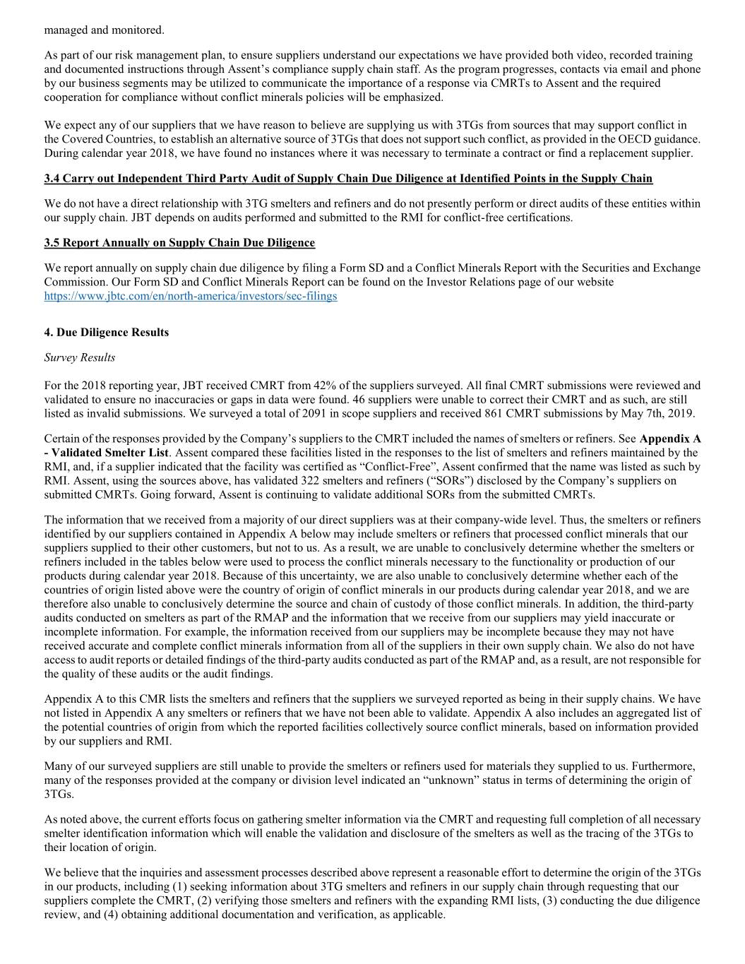 managed and monitored. As part of our risk management plan, to ensure suppliers understand our expectations we have provided both video, recorded training and documented instructions through Assent’s compliance supply chain staff. As the program progresses, contacts via email and phone by our business segments may be utilized to communicate the importance of a response via CMRTs to Assent and the required cooperation for compliance without conflict minerals policies will be emphasized. We expect any of our suppliers that we have reason to believe are supplying us with 3TGs from sources that may support conflict in the Covered Countries, to establish an alternative source of 3TGs that does not support such conflict, as provided in the OECD guidance. During calendar year 2018, we have found no instances where it was necessary to terminate a contract or find a replacement supplier. 3.4 Carry out Independent Third Party Audit of Supply Chain Due Diligence at Identified Points in the Supply Chain We do not have a direct relationship with 3TG smelters and refiners and do not presently perform or direct audits of these entities within our supply chain. JBT depends on audits performed and submitted to the RMI for conflict-free certifications. 3.5 Report Annually on Supply Chain Due Diligence We report annually on supply chain due diligence by filing a Form SD and a Conflict Minerals Report with the Securities and Exchange Commission. Our Form SD and Conflict Minerals Report can be found on the Investor Relations page of our website https://www.jbtc.com/en/north-america/investors/sec-filings 4. Due Diligence Results Survey Results For the 2018 reporting year, JBT received CMRT from 42% of the suppliers surveyed. All final CMRT submissions were reviewed and validated to ensure no inaccuracies or gaps in data were found. 46 suppliers were unable to correct their CMRT and as such, are still listed as invalid submissions. We surveyed a total of 2091 in scope suppliers and received 861 CMRT submissions by May 7th, 2019. Certain of the responses provided by the Company’s suppliers to the CMRT included the names of smelters or refiners. See Appendix A - Validated Smelter List. Assent compared these facilities listed in the responses to the list of smelters and refiners maintained by the RMI, and, if a supplier indicated that the facility was certified as “Conflict-Free”, Assent confirmed that the name was listed as such by RMI. Assent, using the sources above, has validated 322 smelters and refiners (“SORs”) disclosed by the Company’s suppliers on submitted CMRTs. Going forward, Assent is continuing to validate additional SORs from the submitted CMRTs. The information that we received from a majority of our direct suppliers was at their company-wide level. Thus, the smelters or refiners identified by our suppliers contained in Appendix A below may include smelters or refiners that processed conflict minerals that our suppliers supplied to their other customers, but not to us. As a result, we are unable to conclusively determine whether the smelters or refiners included in the tables below were used to process the conflict minerals necessary to the functionality or production of our products during calendar year 2018. Because of this uncertainty, we are also unable to conclusively determine whether each of the countries of origin listed above were the country of origin of conflict minerals in our products during calendar year 2018, and we are therefore also unable to conclusively determine the source and chain of custody of those conflict minerals. In addition, the third-party audits conducted on smelters as part of the RMAP and the information that we receive from our suppliers may yield inaccurate or incomplete information. For example, the information received from our suppliers may be incomplete because they may not have received accurate and complete conflict minerals information from all of the suppliers in their own supply chain. We also do not have access to audit reports or detailed findings of the third-party audits conducted as part of the RMAP and, as a result, are not responsible for the quality of these audits or the audit findings. Appendix A to this CMR lists the smelters and refiners that the suppliers we surveyed reported as being in their supply chains. We have not listed in Appendix A any smelters or refiners that we have not been able to validate. Appendix A also includes an aggregated list of the potential countries of origin from which the reported facilities collectively source conflict minerals, based on information provided by our suppliers and RMI. Many of our surveyed suppliers are still unable to provide the smelters or refiners used for materials they supplied to us. Furthermore, many of the responses provided at the company or division level indicated an “unknown” status in terms of determining the origin of 3TGs. As noted above, the current efforts focus on gathering smelter information via the CMRT and requesting full completion of all necessary smelter identification information which will enable the validation and disclosure of the smelters as well as the tracing of the 3TGs to their location of origin. We believe that the inquiries and assessment processes described above represent a reasonable effort to determine the origin of the 3TGs in our products, including (1) seeking information about 3TG smelters and refiners in our supply chain through requesting that our suppliers complete the CMRT, (2) verifying those smelters and refiners with the expanding RMI lists, (3) conducting the due diligence review, and (4) obtaining additional documentation and verification, as applicable.