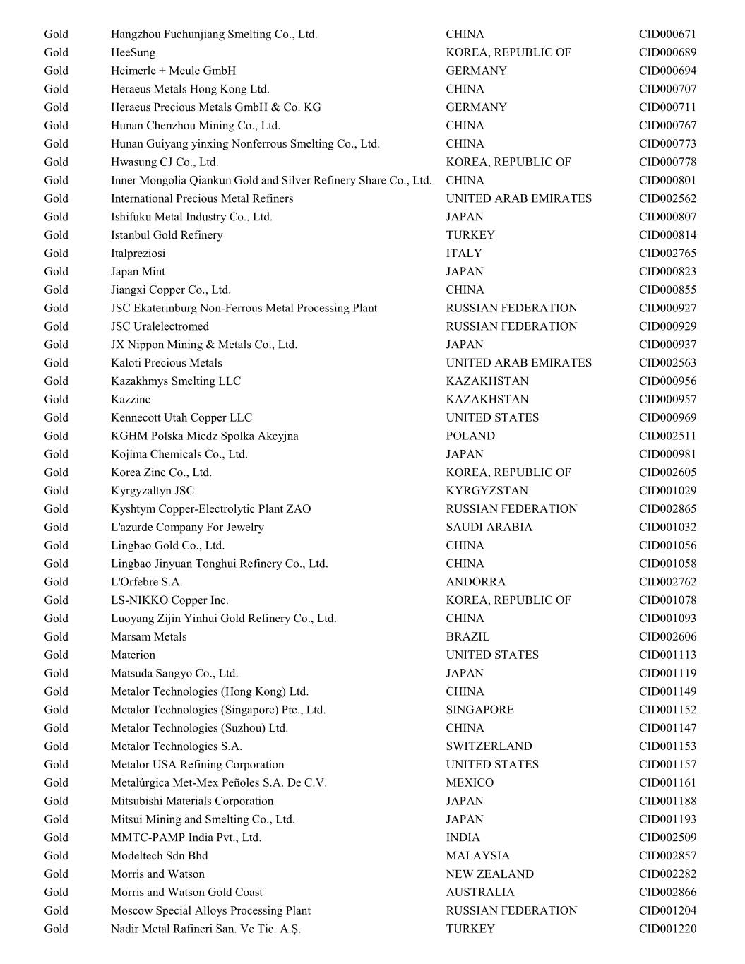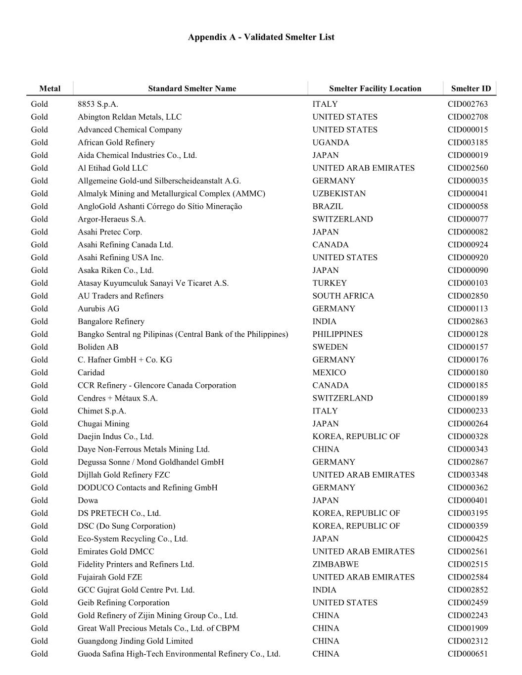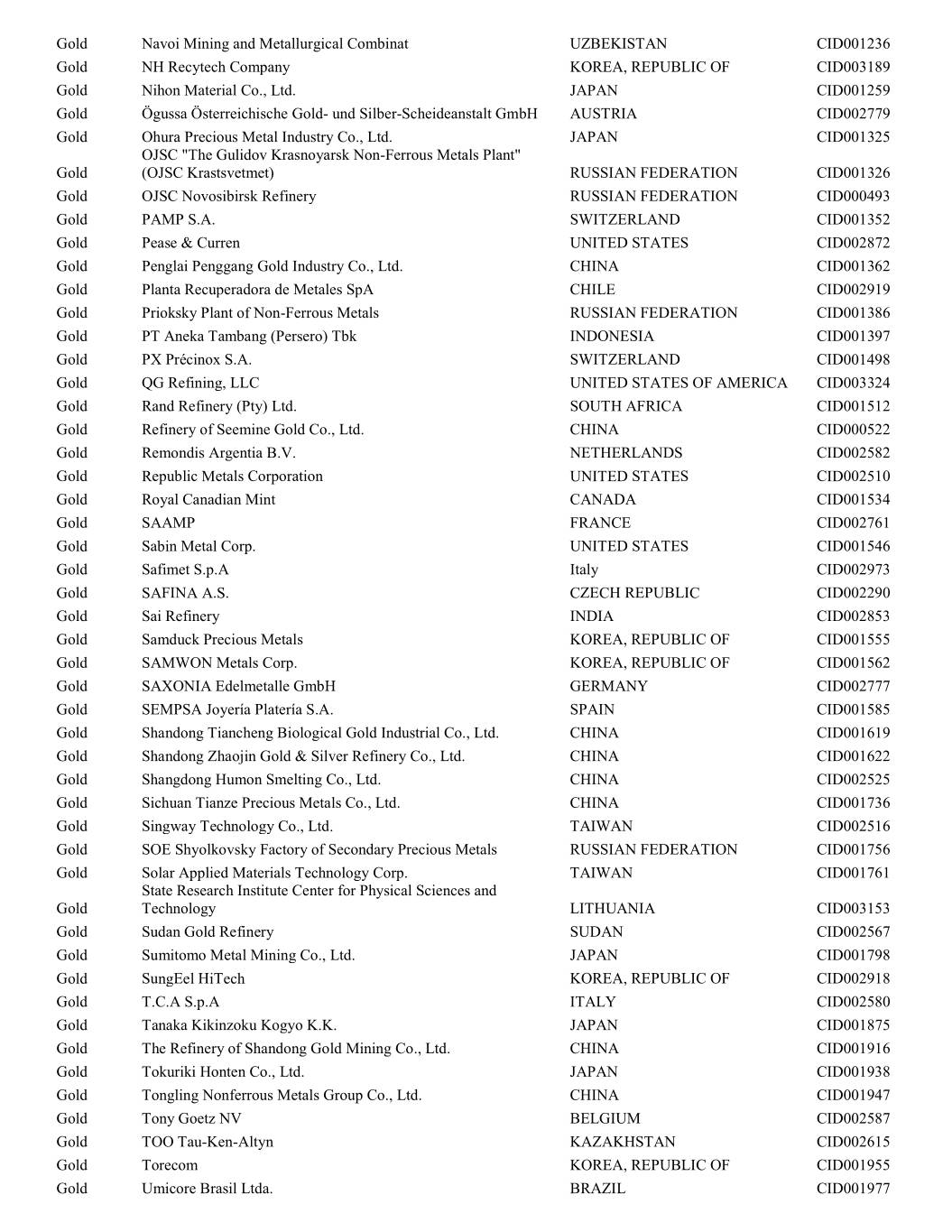 Gold Navoi Mining and Metallurgical Combinat UZBEKISTAN CID001236 Gold NH Recytech Company KOREA, REPUBLIC OF CID003189 Gold Nihon Material Co., Ltd. JAPAN CID001259 Gold Ögussa Österreichische Gold- und Silber-Scheideanstalt GmbH AUSTRIA CID002779 Gold Ohura Precious Metal Industry Co., Ltd. JAPAN CID001325 OJSC "The Gulidov Krasnoyarsk Non-Ferrous Metals Plant" Gold (OJSC Krastsvetmet) RUSSIAN FEDERATION CID001326 Gold OJSC Novosibirsk Refinery RUSSIAN FEDERATION CID000493 Gold PAMP S.A. SWITZERLAND CID001352 Gold Pease & Curren UNITED STATES CID002872 Gold Penglai Penggang Gold Industry Co., Ltd. CHINA CID001362 Gold Planta Recuperadora de Metales SpA CHILE CID002919 Gold Prioksky Plant of Non-Ferrous Metals RUSSIAN FEDERATION CID001386 Gold PT Aneka Tambang (Persero) Tbk INDONESIA CID001397 Gold PX Précinox S.A. SWITZERLAND CID001498 Gold QG Refining, LLC UNITED STATES OF AMERICA CID003324 Gold Rand Refinery (Pty) Ltd. SOUTH AFRICA CID001512 Gold Refinery of Seemine Gold Co., Ltd. CHINA CID000522 Gold Remondis Argentia B.V. NETHERLANDS CID002582 Gold Republic Metals Corporation UNITED STATES CID002510 Gold Royal Canadian Mint CANADA CID001534 Gold SAAMP FRANCE CID002761 Gold Sabin Metal Corp. UNITED STATES CID001546 Gold Safimet S.p.A Italy CID002973 Gold SAFINA A.S. CZECH REPUBLIC CID002290 Gold Sai Refinery INDIA CID002853 Gold Samduck Precious Metals KOREA, REPUBLIC OF CID001555 Gold SAMWON Metals Corp. KOREA, REPUBLIC OF CID001562 Gold SAXONIA Edelmetalle GmbH GERMANY CID002777 Gold SEMPSA Joyería Platería S.A. SPAIN CID001585 Gold Shandong Tiancheng Biological Gold Industrial Co., Ltd. CHINA CID001619 Gold Shandong Zhaojin Gold & Silver Refinery Co., Ltd. CHINA CID001622 Gold Shangdong Humon Smelting Co., Ltd. CHINA CID002525 Gold Sichuan Tianze Precious Metals Co., Ltd. CHINA CID001736 Gold Singway Technology Co., Ltd. TAIWAN CID002516 Gold SOE Shyolkovsky Factory of Secondary Precious Metals RUSSIAN FEDERATION CID001756 Gold Solar Applied Materials Technology Corp. TAIWAN CID001761 State Research Institute Center for Physical Sciences and Gold Technology LITHUANIA CID003153 Gold Sudan Gold Refinery SUDAN CID002567 Gold Sumitomo Metal Mining Co., Ltd. JAPAN CID001798 Gold SungEel HiTech KOREA, REPUBLIC OF CID002918 Gold T.C.A S.p.A ITALY CID002580 Gold Tanaka Kikinzoku Kogyo K.K. JAPAN CID001875 Gold The Refinery of Shandong Gold Mining Co., Ltd. CHINA CID001916 Gold Tokuriki Honten Co., Ltd. JAPAN CID001938 Gold Tongling Nonferrous Metals Group Co., Ltd. CHINA CID001947 Gold Tony Goetz NV BELGIUM CID002587 Gold TOO Tau-Ken-Altyn KAZAKHSTAN CID002615 Gold Torecom KOREA, REPUBLIC OF CID001955 Gold Umicore Brasil Ltda. BRAZIL CID001977