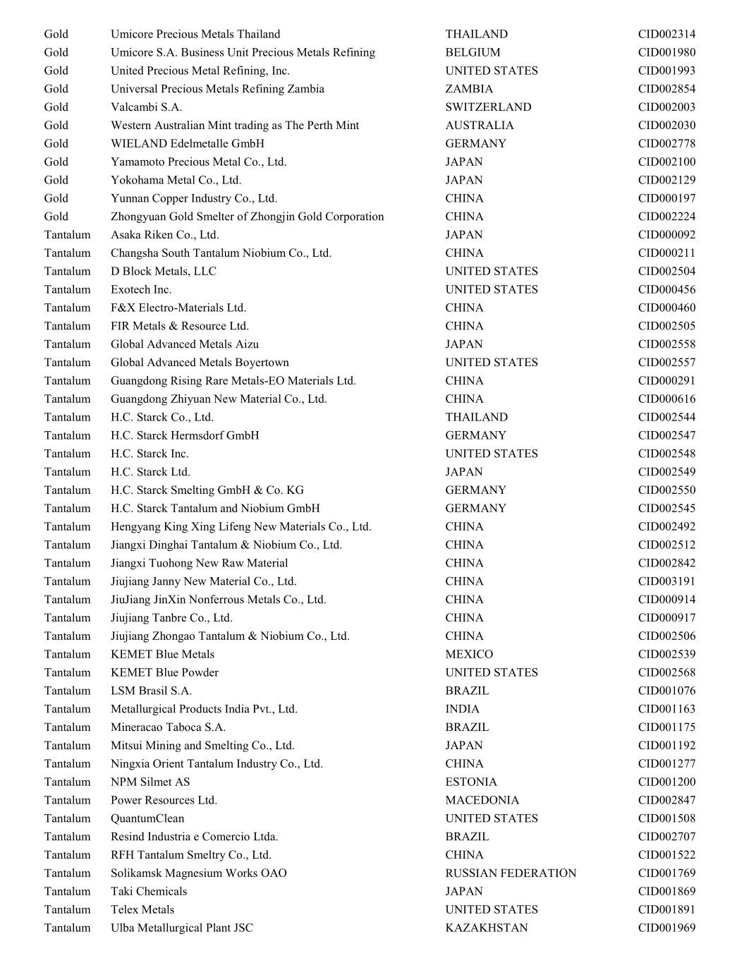 Gold Umicore Precious Metals Thailand THAILAND CID002314 Gold Umicore S.A. Business Unit Precious Metals Refining BELGIUM CID001980 Gold United Precious Metal Refining, Inc. UNITED STATES CID001993 Gold Universal Precious Metals Refining Zambia ZAMBIA CID002854 Gold Valcambi S.A. SWITZERLAND CID002003 Gold Western Australian Mint trading as The Perth Mint AUSTRALIA CID002030 Gold WIELAND Edelmetalle GmbH GERMANY CID002778 Gold Yamamoto Precious Metal Co., Ltd. JAPAN CID002100 Gold Yokohama Metal Co., Ltd. JAPAN CID002129 Gold Yunnan Copper Industry Co., Ltd. CHINA CID000197 Gold Zhongyuan Gold Smelter of Zhongjin Gold Corporation CHINA CID002224 Tantalum Asaka Riken Co., Ltd. JAPAN CID000092 Tantalum Changsha South Tantalum Niobium Co., Ltd. CHINA CID000211 Tantalum D Block Metals, LLC UNITED STATES CID002504 Tantalum Exotech Inc. UNITED STATES CID000456 Tantalum F&X Electro-Materials Ltd. CHINA CID000460 Tantalum FIR Metals & Resource Ltd. CHINA CID002505 Tantalum Global Advanced Metals Aizu JAPAN CID002558 Tantalum Global Advanced Metals Boyertown UNITED STATES CID002557 Tantalum Guangdong Rising Rare Metals-EO Materials Ltd. CHINA CID000291 Tantalum Guangdong Zhiyuan New Material Co., Ltd. CHINA CID000616 Tantalum H.C. Starck Co., Ltd. THAILAND CID002544 Tantalum H.C. Starck Hermsdorf GmbH GERMANY CID002547 Tantalum H.C. Starck Inc. UNITED STATES CID002548 Tantalum H.C. Starck Ltd. JAPAN CID002549 Tantalum H.C. Starck Smelting GmbH & Co. KG GERMANY CID002550 Tantalum H.C. Starck Tantalum and Niobium GmbH GERMANY CID002545 Tantalum Hengyang King Xing Lifeng New Materials Co., Ltd. CHINA CID002492 Tantalum Jiangxi Dinghai Tantalum & Niobium Co., Ltd. CHINA CID002512 Tantalum Jiangxi Tuohong New Raw Material CHINA CID002842 Tantalum Jiujiang Janny New Material Co., Ltd. CHINA CID003191 Tantalum JiuJiang JinXin Nonferrous Metals Co., Ltd. CHINA CID000914 Tantalum Jiujiang Tanbre Co., Ltd. CHINA CID000917 Tantalum Jiujiang Zhongao Tantalum & Niobium Co., Ltd. CHINA CID002506 Tantalum KEMET Blue Metals MEXICO CID002539 Tantalum KEMET Blue Powder UNITED STATES CID002568 Tantalum LSM Brasil S.A. BRAZIL CID001076 Tantalum Metallurgical Products India Pvt., Ltd. INDIA CID001163 Tantalum Mineracao Taboca S.A. BRAZIL CID001175 Tantalum Mitsui Mining and Smelting Co., Ltd. JAPAN CID001192 Tantalum Ningxia Orient Tantalum Industry Co., Ltd. CHINA CID001277 Tantalum NPM Silmet AS ESTONIA CID001200 Tantalum Power Resources Ltd. MACEDONIA CID002847 Tantalum QuantumClean UNITED STATES CID001508 Tantalum Resind Industria e Comercio Ltda. BRAZIL CID002707 Tantalum RFH Tantalum Smeltry Co., Ltd. CHINA CID001522 Tantalum Solikamsk Magnesium Works OAO RUSSIAN FEDERATION CID001769 Tantalum Taki Chemicals JAPAN CID001869 Tantalum Telex Metals UNITED STATES CID001891 Tantalum Ulba Metallurgical Plant JSC KAZAKHSTAN CID001969