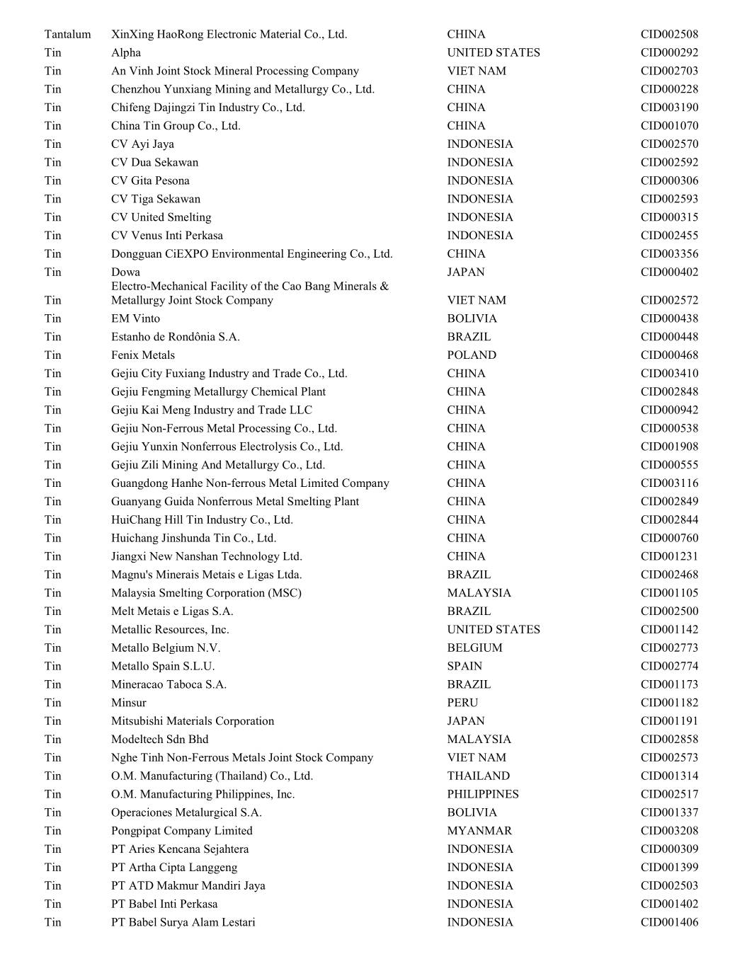 Tantalum XinXing HaoRong Electronic Material Co., Ltd. CHINA CID002508 Tin Alpha UNITED STATES CID000292 Tin An Vinh Joint Stock Mineral Processing Company VIET NAM CID002703 Tin Chenzhou Yunxiang Mining and Metallurgy Co., Ltd. CHINA CID000228 Tin Chifeng Dajingzi Tin Industry Co., Ltd. CHINA CID003190 Tin China Tin Group Co., Ltd. CHINA CID001070 Tin CV Ayi Jaya INDONESIA CID002570 Tin CV Dua Sekawan INDONESIA CID002592 Tin CV Gita Pesona INDONESIA CID000306 Tin CV Tiga Sekawan INDONESIA CID002593 Tin CV United Smelting INDONESIA CID000315 Tin CV Venus Inti Perkasa INDONESIA CID002455 Tin Dongguan CiEXPO Environmental Engineering Co., Ltd. CHINA CID003356 Tin Dowa JAPAN CID000402 Electro-Mechanical Facility of the Cao Bang Minerals & Tin Metallurgy Joint Stock Company VIET NAM CID002572 Tin EM Vinto BOLIVIA CID000438 Tin Estanho de Rondônia S.A. BRAZIL CID000448 Tin Fenix Metals POLAND CID000468 Tin Gejiu City Fuxiang Industry and Trade Co., Ltd. CHINA CID003410 Tin Gejiu Fengming Metallurgy Chemical Plant CHINA CID002848 Tin Gejiu Kai Meng Industry and Trade LLC CHINA CID000942 Tin Gejiu Non-Ferrous Metal Processing Co., Ltd. CHINA CID000538 Tin Gejiu Yunxin Nonferrous Electrolysis Co., Ltd. CHINA CID001908 Tin Gejiu Zili Mining And Metallurgy Co., Ltd. CHINA CID000555 Tin Guangdong Hanhe Non-ferrous Metal Limited Company CHINA CID003116 Tin Guanyang Guida Nonferrous Metal Smelting Plant CHINA CID002849 Tin HuiChang Hill Tin Industry Co., Ltd. CHINA CID002844 Tin Huichang Jinshunda Tin Co., Ltd. CHINA CID000760 Tin Jiangxi New Nanshan Technology Ltd. CHINA CID001231 Tin Magnu's Minerais Metais e Ligas Ltda. BRAZIL CID002468 Tin Malaysia Smelting Corporation (MSC) MALAYSIA CID001105 Tin Melt Metais e Ligas S.A. BRAZIL CID002500 Tin Metallic Resources, Inc. UNITED STATES CID001142 Tin Metallo Belgium N.V. BELGIUM CID002773 Tin Metallo Spain S.L.U. SPAIN CID002774 Tin Mineracao Taboca S.A. BRAZIL CID001173 Tin Minsur PERU CID001182 Tin Mitsubishi Materials Corporation JAPAN CID001191 Tin Modeltech Sdn Bhd MALAYSIA CID002858 Tin Nghe Tinh Non-Ferrous Metals Joint Stock Company VIET NAM CID002573 Tin O.M. Manufacturing (Thailand) Co., Ltd. THAILAND CID001314 Tin O.M. Manufacturing Philippines, Inc. PHILIPPINES CID002517 Tin Operaciones Metalurgical S.A. BOLIVIA CID001337 Tin Pongpipat Company Limited MYANMAR CID003208 Tin PT Aries Kencana Sejahtera INDONESIA CID000309 Tin PT Artha Cipta Langgeng INDONESIA CID001399 Tin PT ATD Makmur Mandiri Jaya INDONESIA CID002503 Tin PT Babel Inti Perkasa INDONESIA CID001402 Tin PT Babel Surya Alam Lestari INDONESIA CID001406