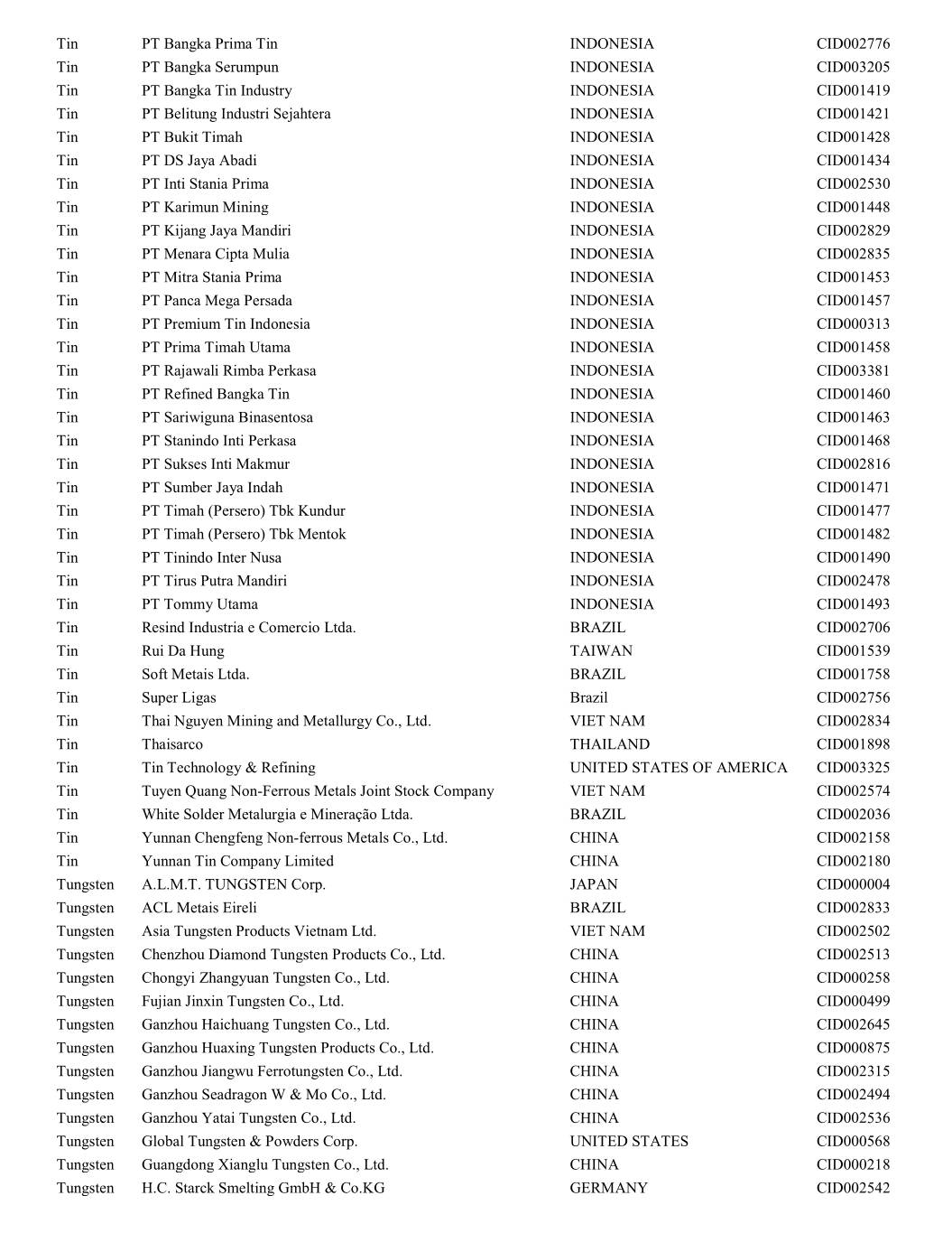 Tin PT Bangka Prima Tin INDONESIA CID002776 Tin PT Bangka Serumpun INDONESIA CID003205 Tin PT Bangka Tin Industry INDONESIA CID001419 Tin PT Belitung Industri Sejahtera INDONESIA CID001421 Tin PT Bukit Timah INDONESIA CID001428 Tin PT DS Jaya Abadi INDONESIA CID001434 Tin PT Inti Stania Prima INDONESIA CID002530 Tin PT Karimun Mining INDONESIA CID001448 Tin PT Kijang Jaya Mandiri INDONESIA CID002829 Tin PT Menara Cipta Mulia INDONESIA CID002835 Tin PT Mitra Stania Prima INDONESIA CID001453 Tin PT Panca Mega Persada INDONESIA CID001457 Tin PT Premium Tin Indonesia INDONESIA CID000313 Tin PT Prima Timah Utama INDONESIA CID001458 Tin PT Rajawali Rimba Perkasa INDONESIA CID003381 Tin PT Refined Bangka Tin INDONESIA CID001460 Tin PT Sariwiguna Binasentosa INDONESIA CID001463 Tin PT Stanindo Inti Perkasa INDONESIA CID001468 Tin PT Sukses Inti Makmur INDONESIA CID002816 Tin PT Sumber Jaya Indah INDONESIA CID001471 Tin PT Timah (Persero) Tbk Kundur INDONESIA CID001477 Tin PT Timah (Persero) Tbk Mentok INDONESIA CID001482 Tin PT Tinindo Inter Nusa INDONESIA CID001490 Tin PT Tirus Putra Mandiri INDONESIA CID002478 Tin PT Tommy Utama INDONESIA CID001493 Tin Resind Industria e Comercio Ltda. BRAZIL CID002706 Tin Rui Da Hung TAIWAN CID001539 Tin Soft Metais Ltda. BRAZIL CID001758 Tin Super Ligas Brazil CID002756 Tin Thai Nguyen Mining and Metallurgy Co., Ltd. VIET NAM CID002834 Tin Thaisarco THAILAND CID001898 Tin Tin Technology & Refining UNITED STATES OF AMERICA CID003325 Tin Tuyen Quang Non-Ferrous Metals Joint Stock Company VIET NAM CID002574 Tin White Solder Metalurgia e Mineração Ltda. BRAZIL CID002036 Tin Yunnan Chengfeng Non-ferrous Metals Co., Ltd. CHINA CID002158 Tin Yunnan Tin Company Limited CHINA CID002180 Tungsten A.L.M.T. TUNGSTEN Corp. JAPAN CID000004 Tungsten ACL Metais Eireli BRAZIL CID002833 Tungsten Asia Tungsten Products Vietnam Ltd. VIET NAM CID002502 Tungsten Chenzhou Diamond Tungsten Products Co., Ltd. CHINA CID002513 Tungsten Chongyi Zhangyuan Tungsten Co., Ltd. CHINA CID000258 Tungsten Fujian Jinxin Tungsten Co., Ltd. CHINA CID000499 Tungsten Ganzhou Haichuang Tungsten Co., Ltd. CHINA CID002645 Tungsten Ganzhou Huaxing Tungsten Products Co., Ltd. CHINA CID000875 Tungsten Ganzhou Jiangwu Ferrotungsten Co., Ltd. CHINA CID002315 Tungsten Ganzhou Seadragon W & Mo Co., Ltd. CHINA CID002494 Tungsten Ganzhou Yatai Tungsten Co., Ltd. CHINA CID002536 Tungsten Global Tungsten & Powders Corp. UNITED STATES CID000568 Tungsten Guangdong Xianglu Tungsten Co., Ltd. CHINA CID000218 Tungsten H.C. Starck Smelting GmbH & Co.KG GERMANY CID002542