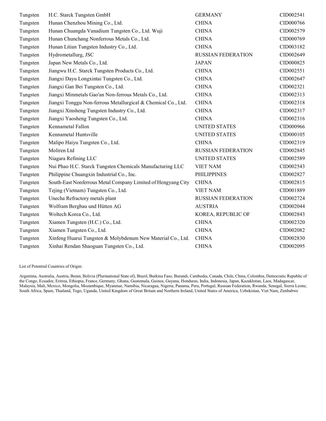 Tungsten H.C. Starck Tungsten GmbH GERMANY CID002541 Tungsten Hunan Chenzhou Mining Co., Ltd. CHINA CID000766 Tungsten Hunan Chuangda Vanadium Tungsten Co., Ltd. Wuji CHINA CID002579 Tungsten Hunan Chunchang Nonferrous Metals Co., Ltd. CHINA CID000769 Tungsten Hunan Litian Tungsten Industry Co., Ltd. CHINA CID003182 Tungsten Hydrometallurg, JSC RUSSIAN FEDERATION CID002649 Tungsten Japan New Metals Co., Ltd. JAPAN CID000825 Tungsten Jiangwu H.C. Starck Tungsten Products Co., Ltd. CHINA CID002551 Tungsten Jiangxi Dayu Longxintai Tungsten Co., Ltd. CHINA CID002647 Tungsten Jiangxi Gan Bei Tungsten Co., Ltd. CHINA CID002321 Tungsten Jiangxi Minmetals Gao'an Non-ferrous Metals Co., Ltd. CHINA CID002313 Tungsten Jiangxi Tonggu Non-ferrous Metallurgical & Chemical Co., Ltd. CHINA CID002318 Tungsten Jiangxi Xinsheng Tungsten Industry Co., Ltd. CHINA CID002317 Tungsten Jiangxi Yaosheng Tungsten Co., Ltd. CHINA CID002316 Tungsten Kennametal Fallon UNITED STATES CID000966 Tungsten Kennametal Huntsville UNITED STATES CID000105 Tungsten Malipo Haiyu Tungsten Co., Ltd. CHINA CID002319 Tungsten Moliren Ltd RUSSIAN FEDERATION CID002845 Tungsten Niagara Refining LLC UNITED STATES CID002589 Tungsten Nui Phao H.C. Starck Tungsten Chemicals Manufacturing LLC VIET NAM CID002543 Tungsten Philippine Chuangxin Industrial Co., Inc. PHILIPPINES CID002827 Tungsten South-East Nonferrous Metal Company Limited of Hengyang City CHINA CID002815 Tungsten Tejing (Vietnam) Tungsten Co., Ltd. VIET NAM CID001889 Tungsten Unecha Refractory metals plant RUSSIAN FEDERATION CID002724 Tungsten Wolfram Bergbau und Hütten AG AUSTRIA CID002044 Tungsten Woltech Korea Co., Ltd. KOREA, REPUBLIC OF CID002843 Tungsten Xiamen Tungsten (H.C.) Co., Ltd. CHINA CID002320 Tungsten Xiamen Tungsten Co., Ltd. CHINA CID002082 Tungsten Xinfeng Huarui Tungsten & Molybdenum New Material Co., Ltd. CHINA CID002830 Tungsten Xinhai Rendan Shaoguan Tungsten Co., Ltd. CHINA CID002095 List of Potential Countries of Origin: Argentina, Australia, Austria, Benin, Bolivia (Plurinational State of), Brazil, Burkina Faso, Burundi, Cambodia, Canada, Chile, China, Colombia, Democratic Republic of the Congo, Ecuador, Eritrea, Ethiopia, France, Germany, Ghana, Guatemala, Guinea, Guyana, Honduras, India, Indonesia, Japan, Kazakhstan, Laos, Madagascar, Malaysia, Mali, Mexico, Mongolia, Mozambique, Myanmar, Namibia, Nicaragua, Nigeria, Panama, Peru, Portugal, Russian Federation, Rwanda, Senegal, Sierra Leone, South Africa, Spain, Thailand, Togo, Uganda, United Kingdom of Great Britain and Northern Ireland, United States of America, Uzbekistan, Viet Nam, Zimbabwe