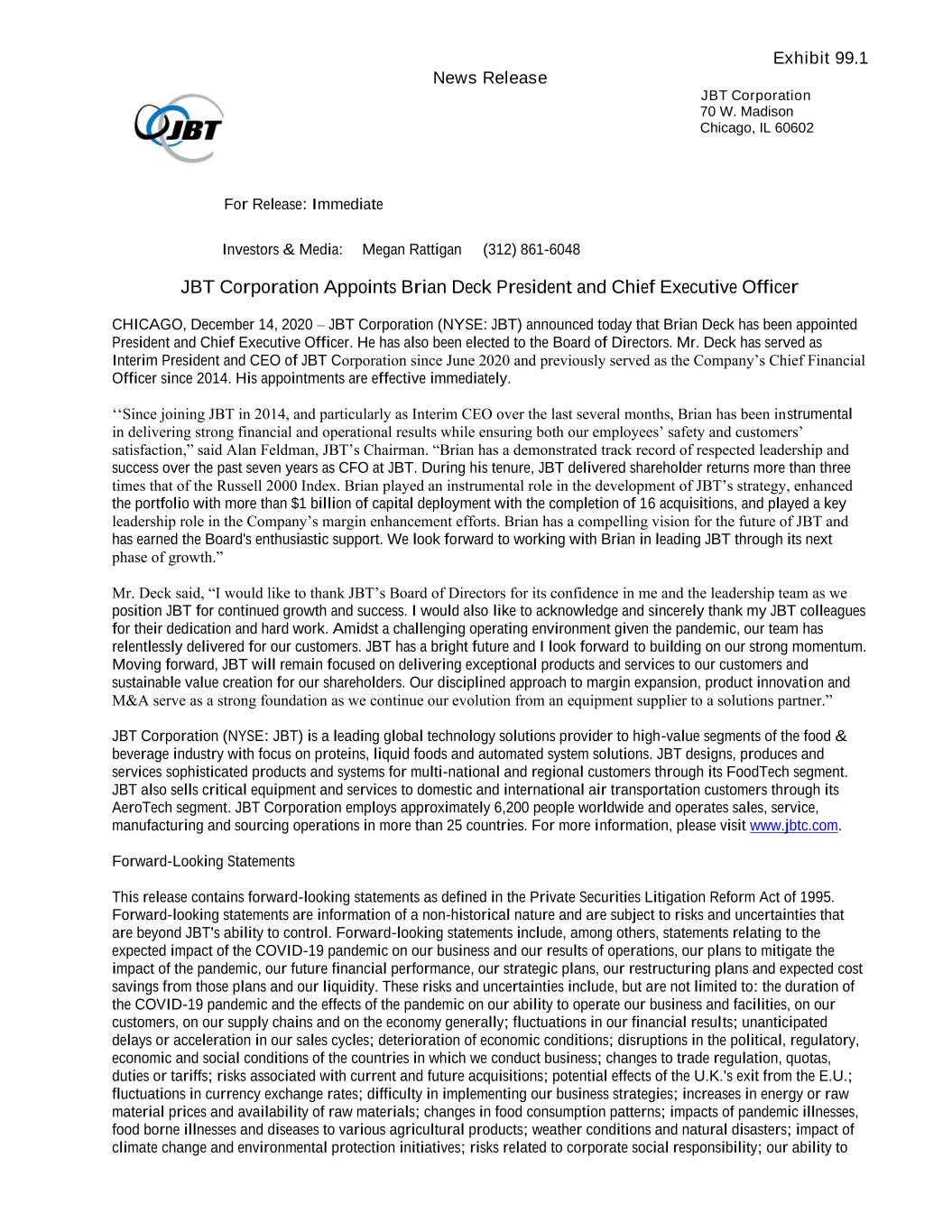 Exhibit 99.1 News Release JBT Corporation 70 W. Madison Chicago, IL 60602 For Release: Immediate Investors & Media: Megan Rattigan (312) 861-6048 JBT Corporation Appoints Brian Deck President and Chief Executive Officer CHICAGO, December 14, 2020 – JBT Corporation (NYSE: JBT) announced today that Brian Deck has been appointed President and Chief Executive Officer. He has also been elected to the Board of Directors. Mr. Deck has served as Interim President and CEO of JBT Corporation since June 2020 and previously served as the Company’s Chief Financial Officer since 2014. His appointments are effective immediately. ‘‘Since joining JBT in 2014, and particularly as Interim CEO over the last several months, Brian has been instrumental in delivering strong financial and operational results while ensuring both our employees’ safety and customers’ satisfaction,” said Alan Feldman, JBT’s Chairman. “Brian has a demonstrated track record of respected leadership and success over the past seven years as CFO at JBT. During his tenure, JBT delivered shareholder returns more than three times that of the Russell 2000 Index. Brian played an instrumental role in the development of JBT’s strategy, enhanced the portfolio with more than $1 billion of capital deployment with the completion of 16 acquisitions, and played a key leadership role in the Company’s margin enhancement efforts. Brian has a compelling vision for the future of JBT and has earned the Board's enthusiastic support. We look forward to working with Brian in leading JBT through its next phase of growth.” Mr. Deck said, “I would like to thank JBT’s Board of Directors for its confidence in me and the leadership team as we position JBT for continued growth and success. I would also like to acknowledge and sincerely thank my JBT colleagues for their dedication and hard work. Amidst a challenging operating environment given the pandemic, our team has relentlessly delivered for our customers. JBT has a bright future and I look forward to building on our strong momentum. Moving forward, JBT will remain focused on delivering exceptional products and services to our customers and sustainable value creation for our shareholders. Our disciplined approach to margin expansion, product innovation and M&A serve as a strong foundation as we continue our evolution from an equipment supplier to a solutions partner.” JBT Corporation (NYSE: JBT) is a leading global technology solutions provider to high-value segments of the food & beverage industry with focus on proteins, liquid foods and automated system solutions. JBT designs, produces and services sophisticated products and systems for multi-national and regional customers through its FoodTech segment. JBT also sells critical equipment and services to domestic and international air transportation customers through its AeroTech segment. JBT Corporation employs approximately 6,200 people worldwide and operates sales, service, manufacturing and sourcing operations in more than 25 countries. For more information, please visit www.jbtc.com. Forward-Looking Statements This release contains forward-looking statements as defined in the Private Securities Litigation Reform Act of 1995. Forward-looking statements are information of a non-historical nature and are subject to risks and uncertainties that are beyond JBT's ability to control. Forward-looking statements include, among others, statements relating to the expected impact of the COVID-19 pandemic on our business and our results of operations, our plans to mitigate the impact of the pandemic, our future financial performance, our strategic plans, our restructuring plans and expected cost savings from those plans and our liquidity. These risks and uncertainties include, but are not limited to: the duration of the COVID-19 pandemic and the effects of the pandemic on our ability to operate our business and facilities, on our customers, on our supply chains and on the economy generally; fluctuations in our financial results; unanticipated delays or acceleration in our sales cycles; deterioration of economic conditions; disruptions in the political, regulatory, economic and social conditions of the countries in which we conduct business; changes to trade regulation, quotas, duties or tariffs; risks associated with current and future acquisitions; potential effects of the U.K.'s exit from the E.U.; fluctuations in currency exchange rates; difficulty in implementing our business strategies; increases in energy or raw material prices and availability of raw materials; changes in food consumption patterns; impacts of pandemic illnesses, food borne illnesses and diseases to various agricultural products; weather conditions and natural disasters; impact of climate change and environmental protection initiatives; risks related to corporate social responsibility; our ability to