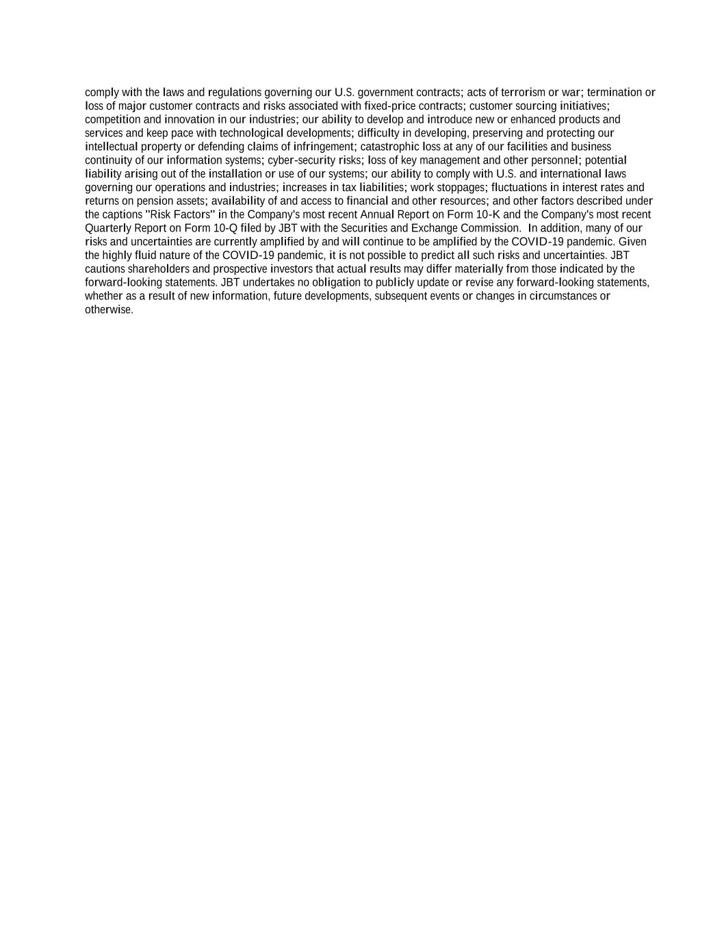 comply with the laws and regulations governing our U.S. government contracts; acts of terrorism or war; termination or loss of major customer contracts and risks associated with fixed-price contracts; customer sourcing initiatives; competition and innovation in our industries; our ability to develop and introduce new or enhanced products and services and keep pace with technological developments; difficulty in developing, preserving and protecting our intellectual property or defending claims of infringement; catastrophic loss at any of our facilities and business continuity of our information systems; cyber-security risks; loss of key management and other personnel; potential liability arising out of the installation or use of our systems; our ability to comply with U.S. and international laws governing our operations and industries; increases in tax liabilities; work stoppages; fluctuations in interest rates and returns on pension assets; availability of and access to financial and other resources; and other factors described under the captions "Risk Factors" in the Company's most recent Annual Report on Form 10-K and the Company's most recent Quarterly Report on Form 10-Q filed by JBT with the Securities and Exchange Commission. In addition, many of our risks and uncertainties are currently amplified by and will continue to be amplified by the COVID-19 pandemic. Given the highly fluid nature of the COVID-19 pandemic, it is not possible to predict all such risks and uncertainties. JBT cautions shareholders and prospective investors that actual results may differ materially from those indicated by the forward-looking statements. JBT undertakes no obligation to publicly update or revise any forward-looking statements, whether as a result of new information, future developments, subsequent events or changes in circumstances or otherwise.