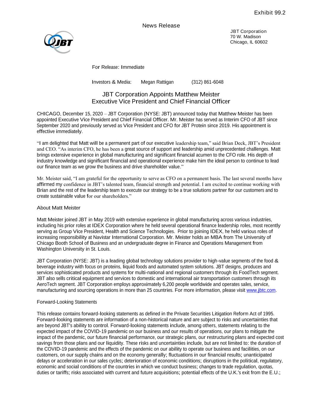 Exhibit 99.2 News Release JBT Corporation 70 W. Madison Chicago, IL 60602 For Release: Immediate Investors & Media: Megan Rattigan (312) 861-6048 JBT Corporation Appoints Matthew Meister Executive Vice President and Chief Financial Officer CHICAGO, December 15, 2020 – JBT Corporation (NYSE: JBT) announced today that Matthew Meister has been appointed Executive Vice President and Chief Financial Officer. Mr. Meister has served as Interim CFO of JBT since September 2020 and previously served as Vice President and CFO for JBT Protein since 2019. His appointment is effective immediately. “I am delighted that Matt will be a permanent part of our executive leadership team,” said Brian Deck, JBT’s President and CEO. “As interim CFO, he has been a great source of support and leadership amid unprecedented challenges. Matt brings extensive experience in global manufacturing and significant financial acumen to the CFO role. His depth of industry knowledge and significant financial and operational experience make him the ideal person to continue to lead our finance team as we grow the business and drive shareholder value.” Mr. Meister said, “I am grateful for the opportunity to serve as CFO on a permanent basis. The last several months have affirmed my confidence in JBT’s talented team, financial strength and potential. I am excited to continue working with Brian and the rest of the leadership team to execute our strategy to be a true solutions partner for our customers and to create sustainable value for our shareholders.” About Matt Meister Matt Meister joined JBT in May 2019 with extensive experience in global manufacturing across various industries, including his prior roles at IDEX Corporation where he held several operational finance leadership roles, most recently serving as Group Vice President, Health and Science Technologies. Prior to joining IDEX, he held various roles of increasing responsibility at Navistar International Corporation. Mr. Meister holds an MBA from The University of Chicago Booth School of Business and an undergraduate degree in Finance and Operations Management from Washington University in St. Louis. JBT Corporation (NYSE: JBT) is a leading global technology solutions provider to high-value segments of the food & beverage industry with focus on proteins, liquid foods and automated system solutions. JBT designs, produces and services sophisticated products and systems for multi-national and regional customers through its FoodTech segment. JBT also sells critical equipment and services to domestic and international air transportation customers through its AeroTech segment. JBT Corporation employs approximately 6,200 people worldwide and operates sales, service, manufacturing and sourcing operations in more than 25 countries. For more information, please visit www.jbtc.com. Forward-Looking Statements This release contains forward-looking statements as defined in the Private Securities Litigation Reform Act of 1995. Forward-looking statements are information of a non-historical nature and are subject to risks and uncertainties that are beyond JBT's ability to control. Forward-looking statements include, among others, statements relating to the expected impact of the COVID-19 pandemic on our business and our results of operations, our plans to mitigate the impact of the pandemic, our future financial performance, our strategic plans, our restructuring plans and expected cost savings from those plans and our liquidity. These risks and uncertainties include, but are not limited to: the duration of the COVID-19 pandemic and the effects of the pandemic on our ability to operate our business and facilities, on our customers, on our supply chains and on the economy generally; fluctuations in our financial results; unanticipated delays or acceleration in our sales cycles; deterioration of economic conditions; disruptions in the political, regulatory, economic and social conditions of the countries in which we conduct business; changes to trade regulation, quotas, duties or tariffs; risks associated with current and future acquisitions; potential effects of the U.K.'s exit from the E.U.;